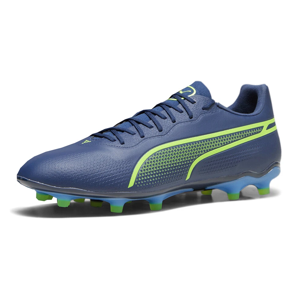 King Pro Firm Ground/Artificial Ground Soccer Cleats Product Details Lightweight thermoplastic polyurethane outsole with conical studs. Knitted low-cut slip-on construction ensures a comfortable fit. Lightweight removable sockliner. Control never felt this comfortable. An icon that spans generations, the King is back with bold design upgrades and innovative materials that work better – for the player and for the planet. Like the all-new K-Better upper material, made with recycled content while also improving the signature touch, comfort, and stretch resistance. The new lightweight outsole features an external heel counter, integrated stability spine, and conical studs, so you have as much control over your movement as you do over the ball. Additional Details Color: Blue, Green Occasion: Casual Gender: Mens Age: Adult Brand: Puma