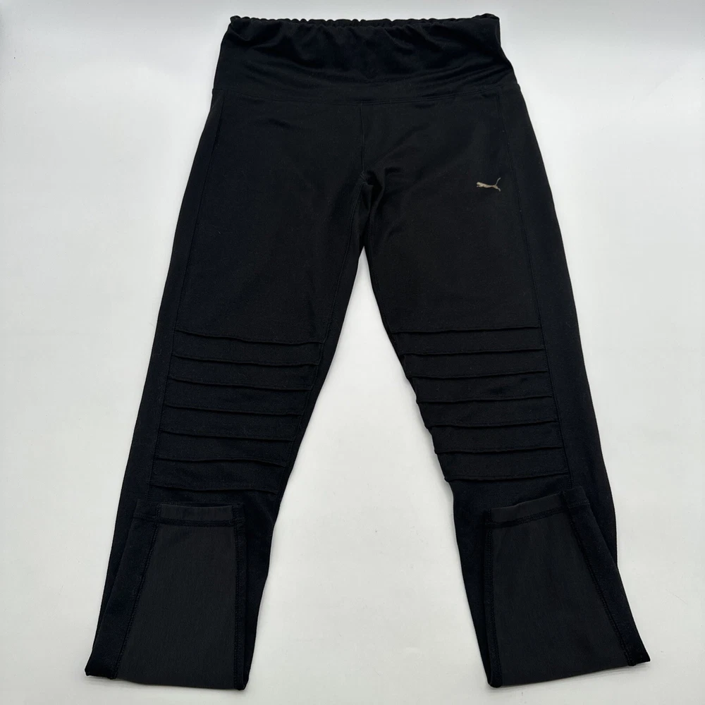 This is a pair of PUMA leggings for women in size XL. They are solid black with a logo design, featuring a pull-on closure and an ankle length. Made of a blend of spandex and cotton, these leggings offer a relaxed fit with compression on the legs. Suitable for activewear, they have an elastic waist for comfort during activities like gym training, cross-training, and running. Ideal for summer and spring seasons. Check pictures for flaws and measurements