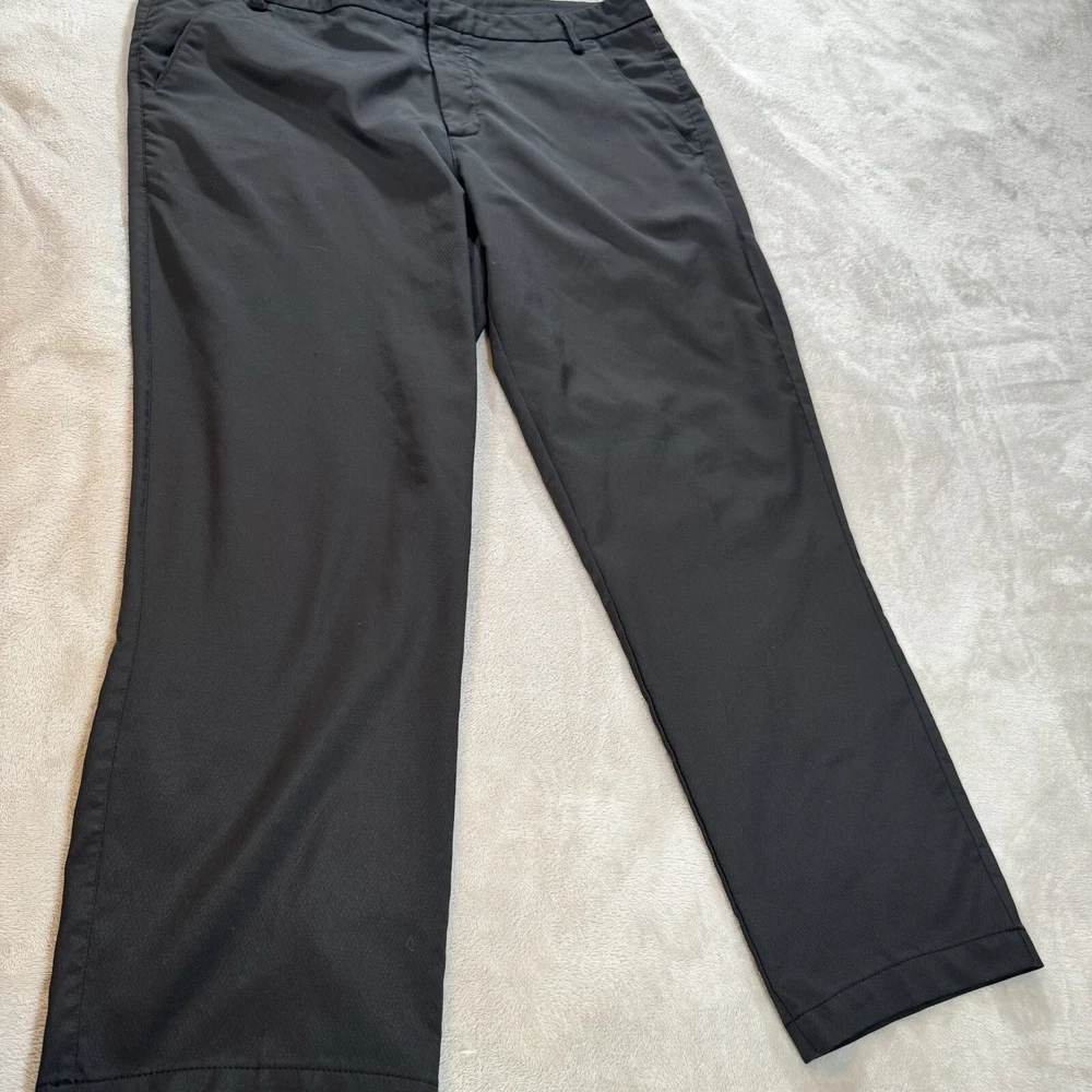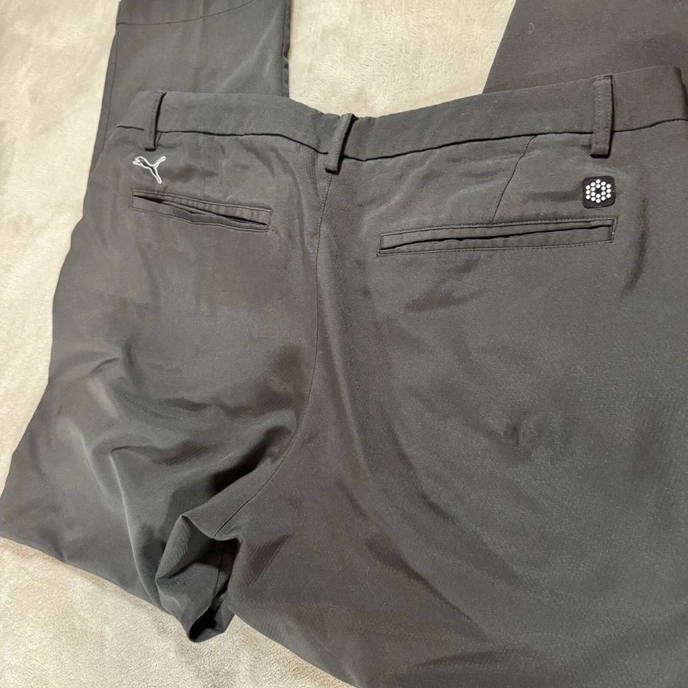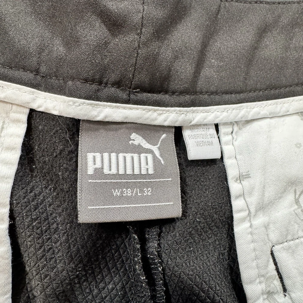 Look stylish and feel comfortable on the golf course with these Puma men's golf pants in black. The flat front straight leg pants have a 5-pocket design and a logo button accent. They are made of a polyester blend material and have a regular fit. These pants are perfect for casual occasions and can be worn in any season. The zip closure and machine washable garment care make them both convenient and easy to maintain. With a waist size of 38 inches and an inseam of 32 inches, these pants are a great addition to any golfer's wardrobe.
