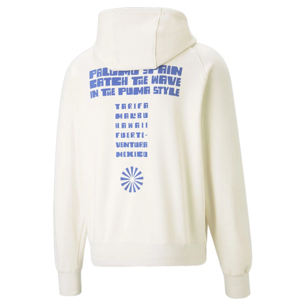 Palomo x Pullover Hoodie Product Details Relaxed fit 450 gsm French terry jersey Hood with drawstrings Raglan sleeves with zigzag stitching Engineered rib cuffs and hem The second season of PUMA x PALOMO draws inspiration from summer sports and vintage surf posters from Hawai'i and southern Spain. The collection's pieces feature bold, colorful graphics, quality materials, and a ‘70s-inspired aesthetic. The long-sleeved terry hoodie offers both comfort and style, and will travel effortlessly from gym to pub and back again. Additional Details Color: White Occasion: Casual Gender: Mens Age: Adult Brand: Puma