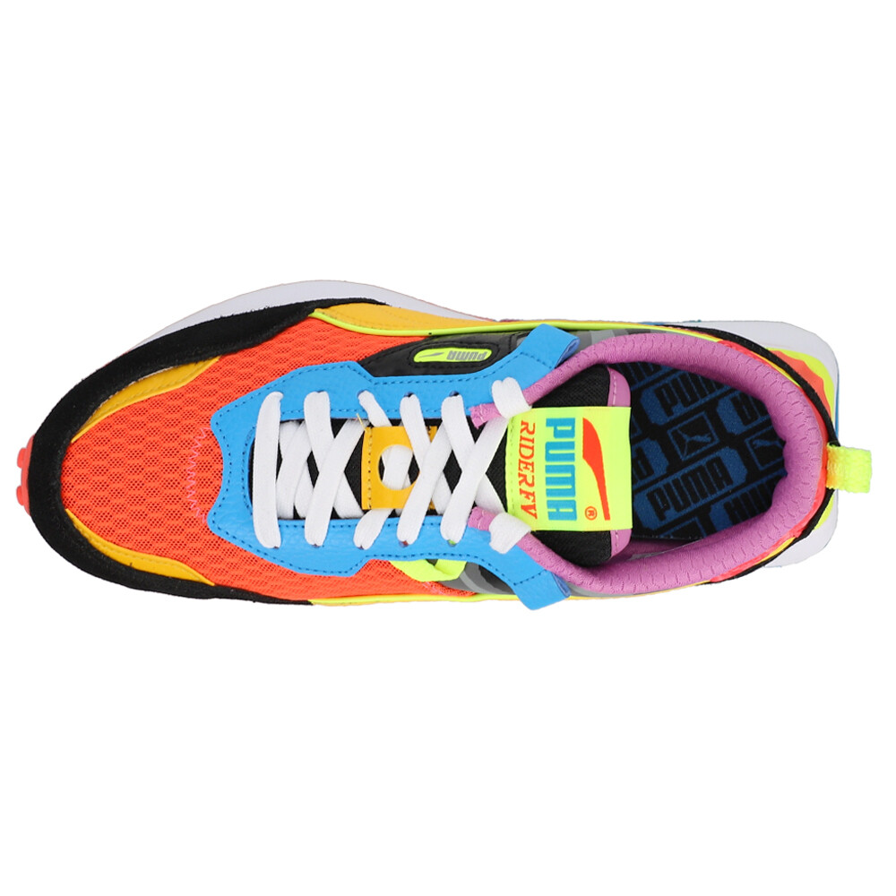 Rider Fv Lava Lace Up Sneakers (Big Kid) Product Details Mesh upper Leather and suede overlays Foam midsole Rubber outsole The newest addition to the Rider family is celebrating the past while standing firmly in the present – just like the people who wear it. Rider FV is all about a combination of past and future, with a nostalgic, heritage-inspired upper and fresh tooling. LAVA features bright and energetic color palettes with glow in the dark accents. Glow in the Dark lava graphic print on the collar. Additional Details Color: Black Occasion: Casual Gender: Boys Age: Youth Brand: Puma