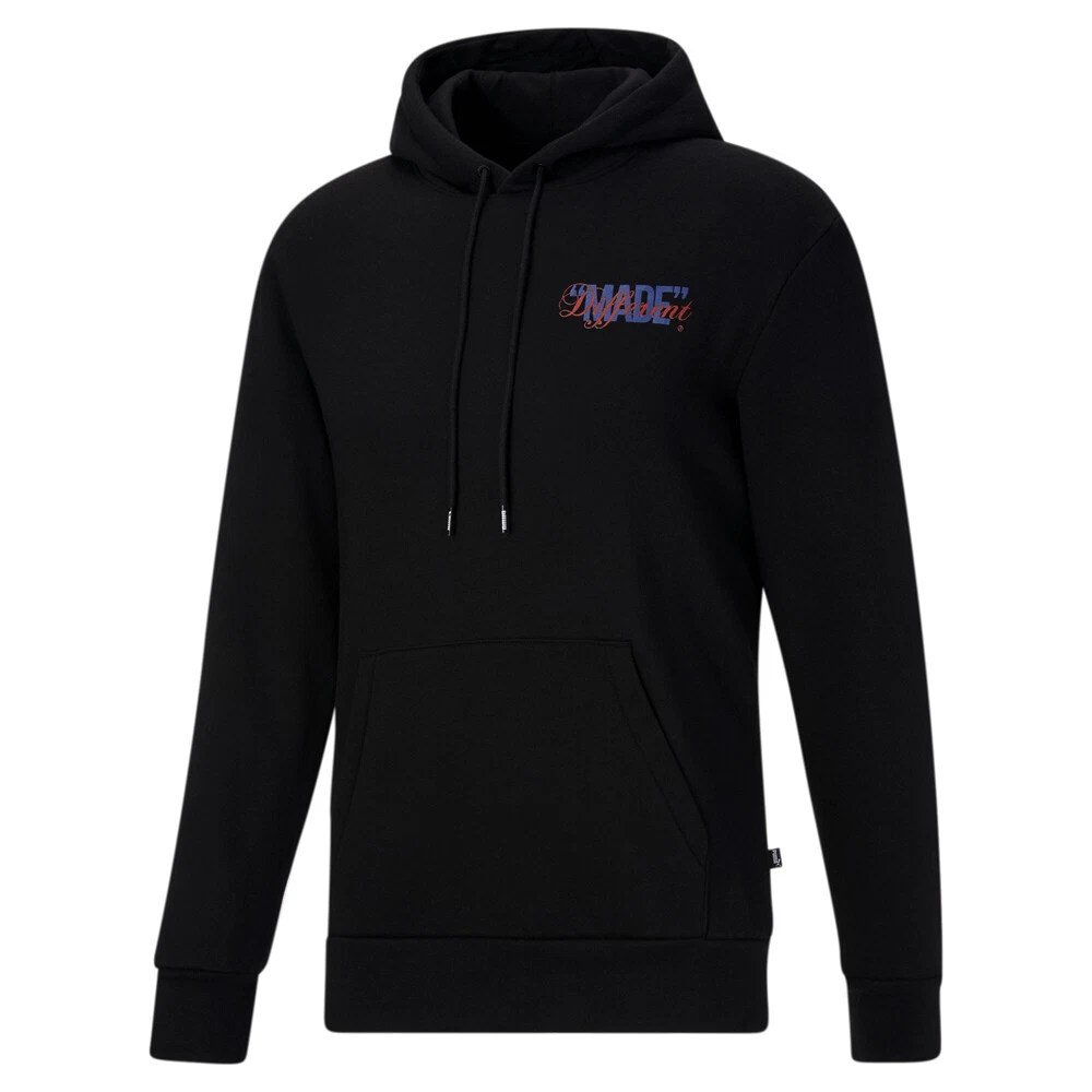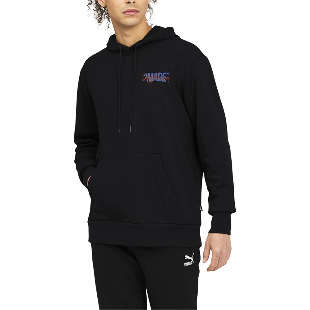 RJB X Made Different Pullover Hoodie Product Details Relaxed fit Kangaroo pocket Hood with drawcords 66% Cotton, 34% Polyester Pick up this exclusive graphic hoodie to up your style game. Additional Details Color: Black Occasion: Casual Gender: Mens Age: Adult Brand: Puma