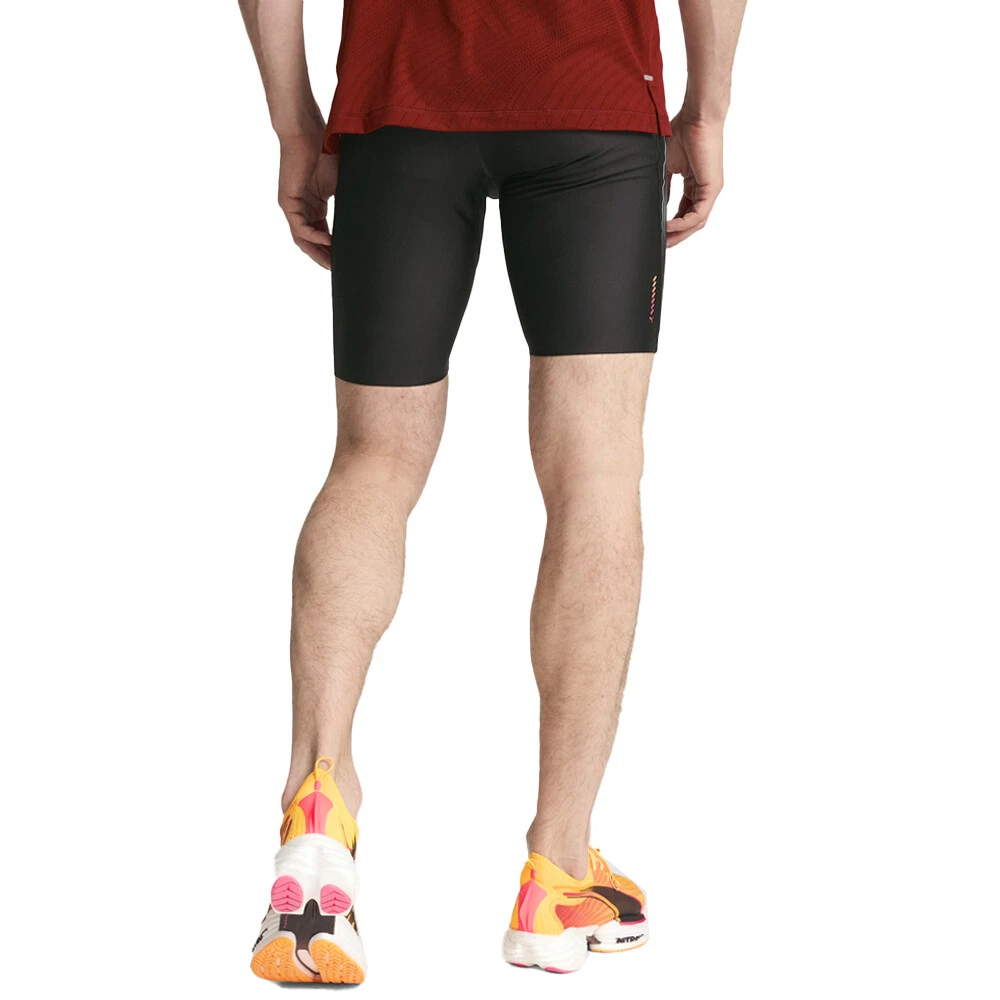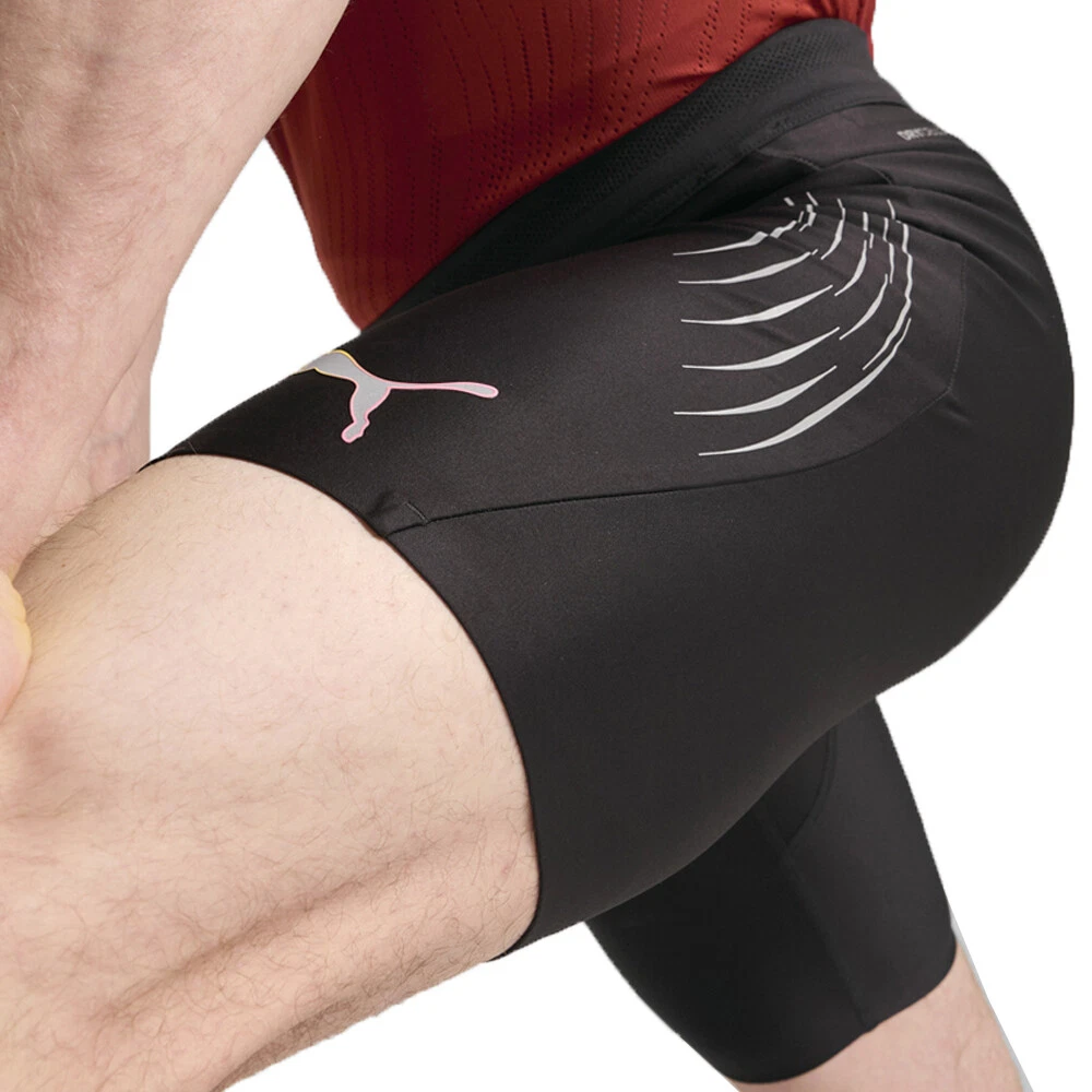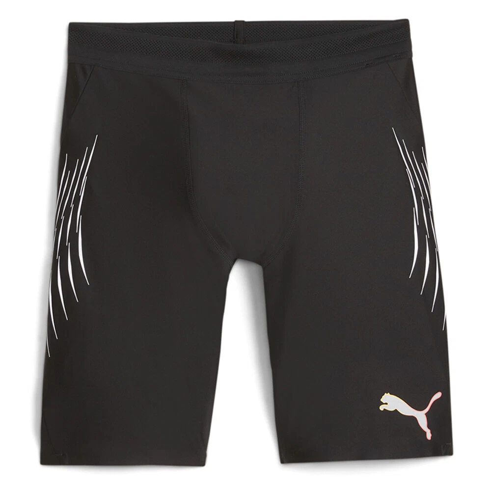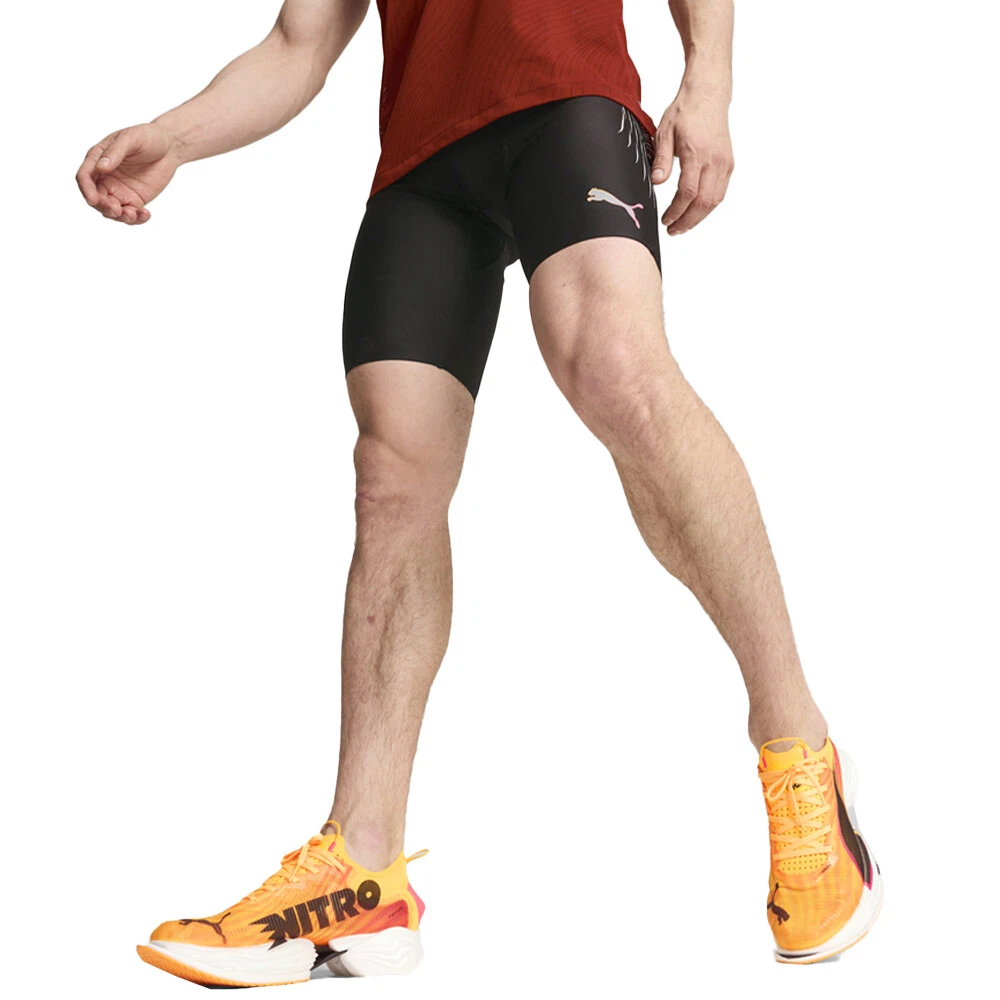 Run Elite Reflective Athletic Leggings Product Details Tight fit Medium rise Compressive design Elastic waistband PUMA branding details Power through interval runs in PUMA's RUN Elite Short Tights. Compression fabric maximises speed and endurance, while strategically placed mesh keeps you cool. Built for elite performance, these tights move with your body for a barely-there feel so you can push harder with every stride. Additional Details Color: Black Occasion: Gender: Mens Age: Adult Brand: Puma
