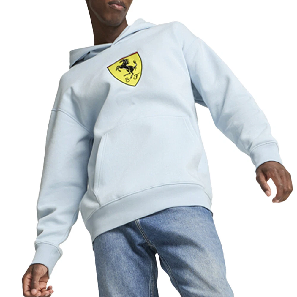 SF Race Big Shield Pullover Hoodie Product Details Regular fit, regular length 68% cotton, 32% polyester Brushed fleece lining Hood Long sleeves Accelerate your style in this bold SF hoodie. The brushed fleece lining keeps you warm as the SF shield boldly proclaims your passion for speed. Conquer cold weather and show your love for the prancing horse. Additional Details Color: Blue Occasion: Casual Gender: Mens Age: Adult Brand: Puma