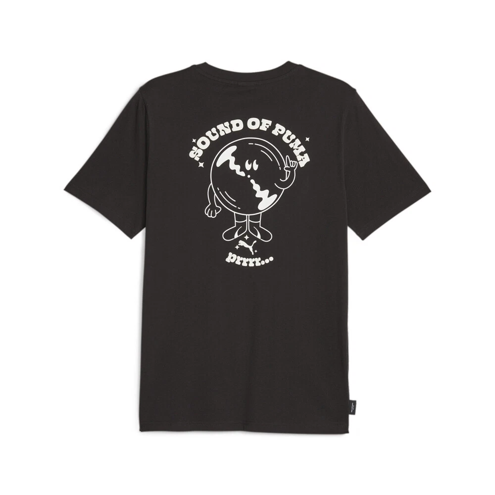 Sound Of Puma Graphic Crew Neck Short Sleeve T-Shirt Product Details Regular fit Graphic print on the front and back Single jersey 100% cotton If you're the t-shirt and jeans type or straight up just want a new, simple tee in your rotation, don't sleep on the SOUND OF PUMA Graphic Tee. It's a relaxed-fit men's t-shirt with a retro-inspired PUMA graphic print on the front. Additional Details Color: Black Occasion: Casual Gender: Mens Age: Adult Brand: Puma