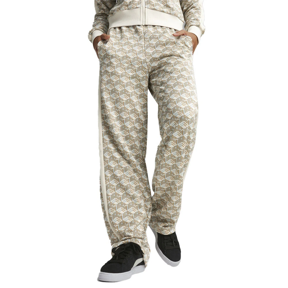 T7 Straight Leg Track Pants Product Details Comfort fit 320 grams per square meter, French terry Elastic waistband with external drawcords Side seam pockets T7 panel inserts Straight out of the '70s Puma Archives, the T7 gets a fresh update, and this time the OG track pants are reworked with a much more relaxed vibe. It features a looser fit than the OG track pants, and straight legs with open cuffs as well as an ornate all-over-print. Of course, the signature stripes are still on the sides. Additional Details Color: Beige Occasion: Casual Gender: Womens Age: Adult Brand: Puma