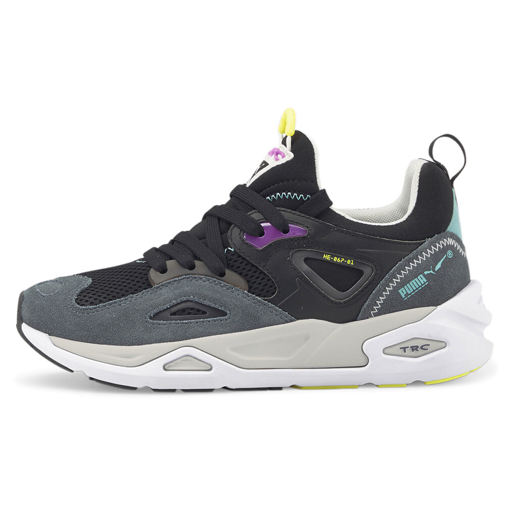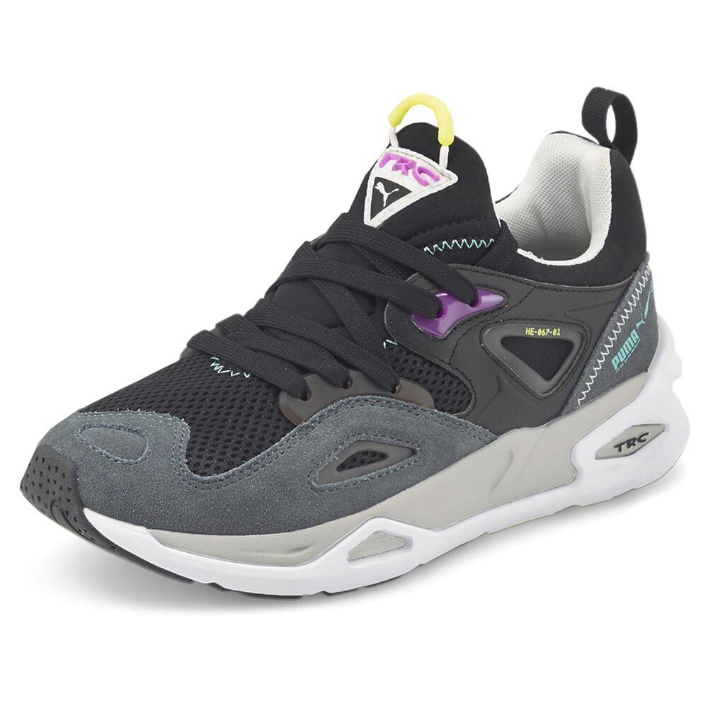 Trc Blaze Lace Up Sneakers (Big Kid) Product Details Mesh upper with suede overlays Lace up closure CMEVA midsole Non-marking rubber outsole Way back in the '90s, our Trinomic sneakers heralded a new age of shoe technology. The designs centered around three core elements: cushioning, flexibility and stability – represented by the iconic triangle logo. Three decades later, we're proud to introduce the TRC Blaze, inspired by the very same vintage running models. This time, an athletic mesh upper collides with suede overlays, Lycra features and TPU elements to form a chunky, cutting-edge silhouette. Additional Details Color: Black Occasion: Casual Gender: Boys Age: Youth Brand: Puma