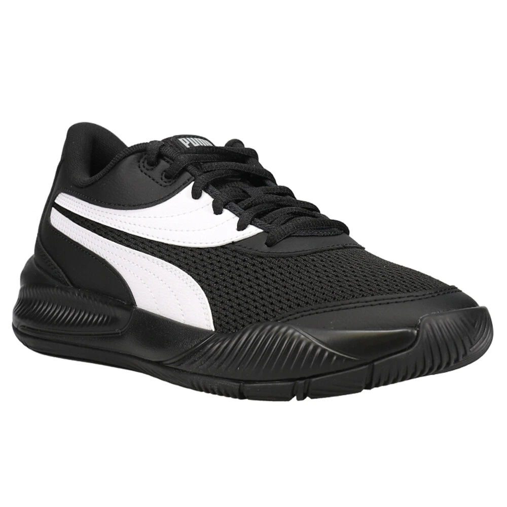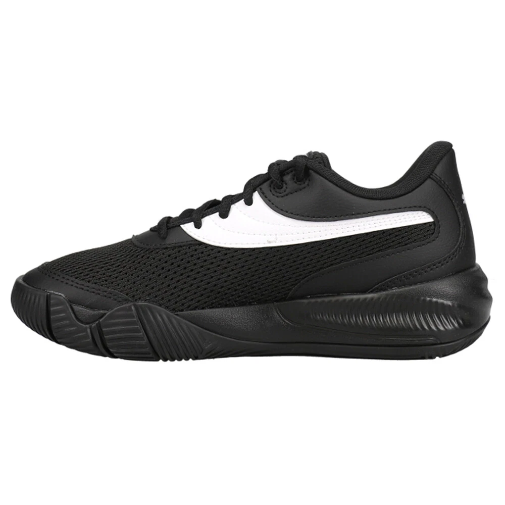 Triple Basketball Shoes (Big Kid) Product Details Textile upper with mesh and leather overlays Textile tongue Full-length ProFoam midsole engineered for basketball Full-coverage rubber outsole Amplify your style threefold in our Triple trainers, a basketball shoe that is style cubed. The placement of triple PUMA Formstrips takes the stunning silhouette of this trainer over the top. Our Triple Basketball Shoes feature amazing performance, equipped with a ProFoam midsole for lightweight cushioning and impeccable energy return and bold a design for the baller who wants to stand out from the crowd. Additional Details Color: Black, White Occasion: Casual Gender: Boys Age: Youth Brand: Puma