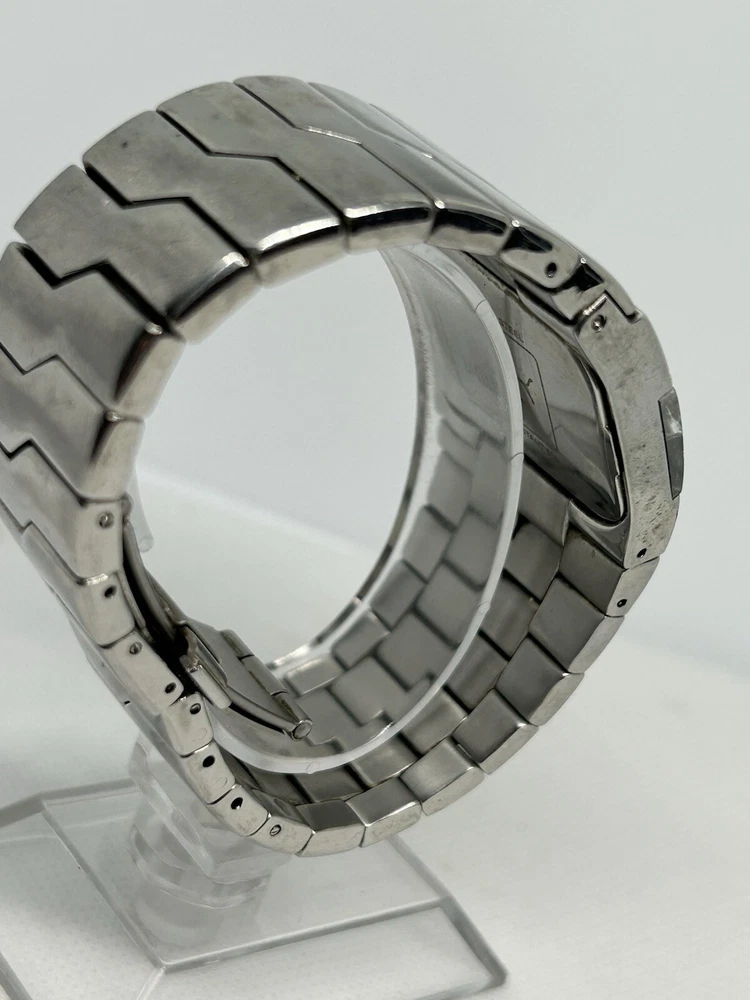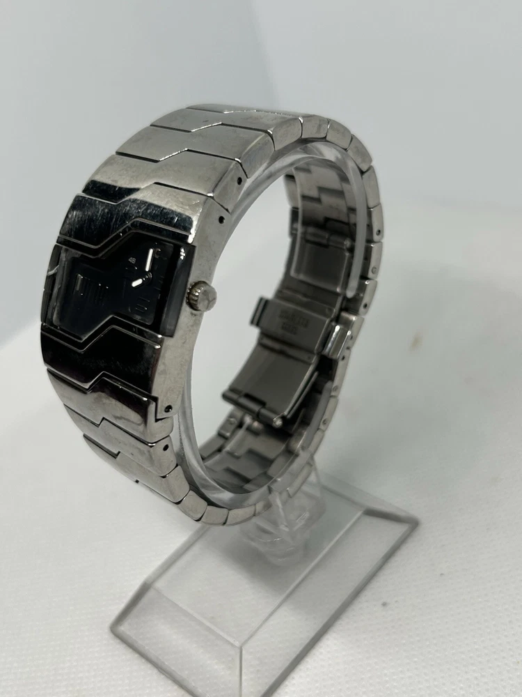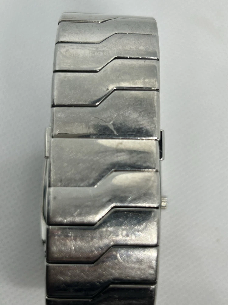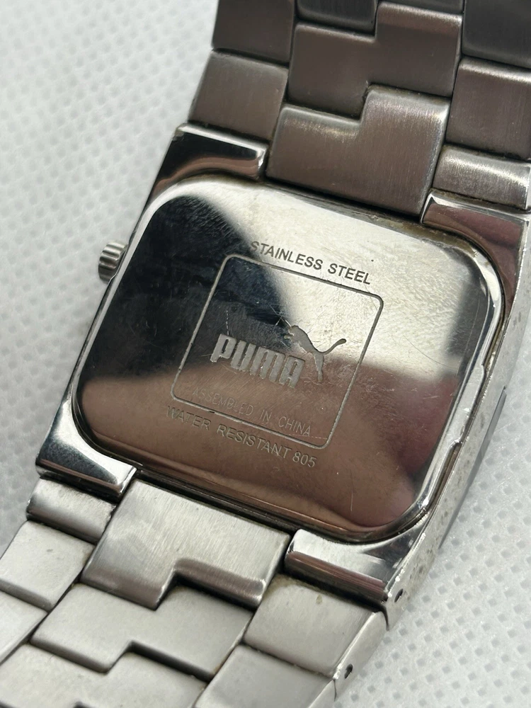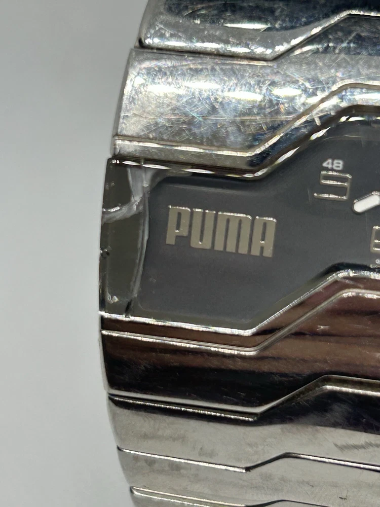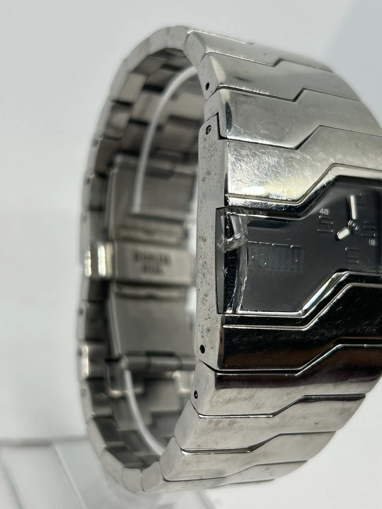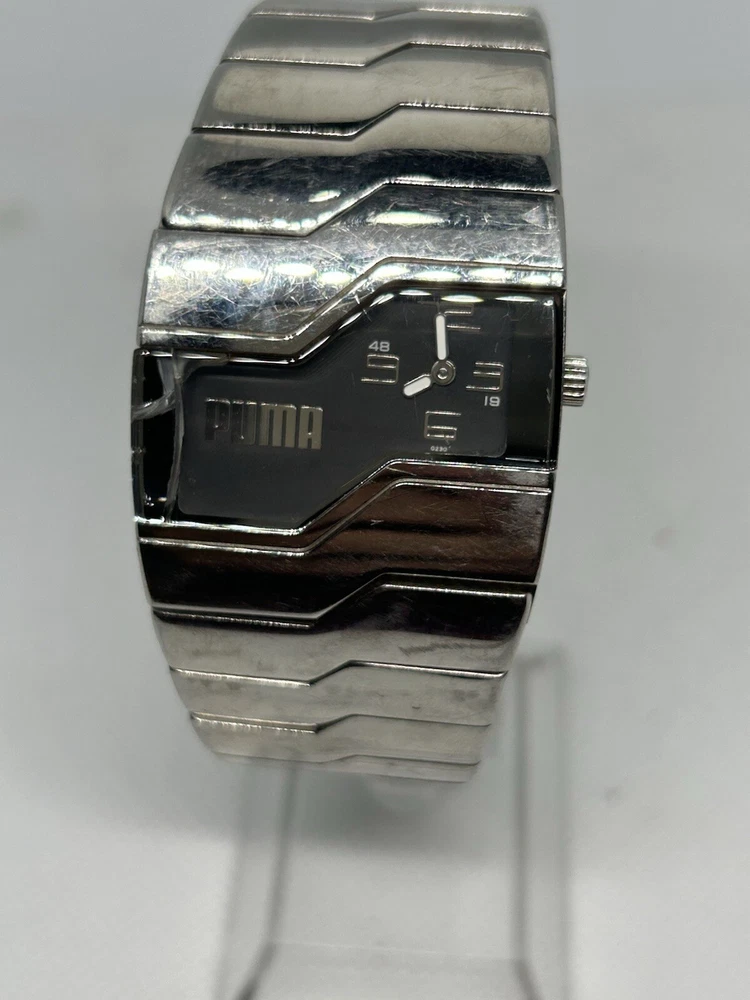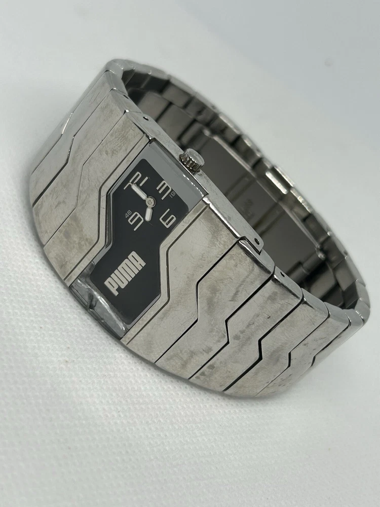 This Puma Women's Temptation watch boasts a sleek black dial with Arabic numerals and a 12-hour dial. The stainless steel and metal band, along with the silver bezel and case, provide a stylish and durable design. The watch features quartz movement and is water-resistant up to 30m. Ideal for casual, dress, or sporty occasions, this Puma watch is a versatile addition to any wardrobe. The rectangular case measures 36mm, and the watch comes without papers or original packaging. Perfect for those who appreciate a combination of style and functionality. This watch is pre owned and is in good condition m. Watch does have some signs of use to it including significant scratches on its bracelet and it has a crack in its glass. Other than this watch works as it should and fully functional. Comes as shown
