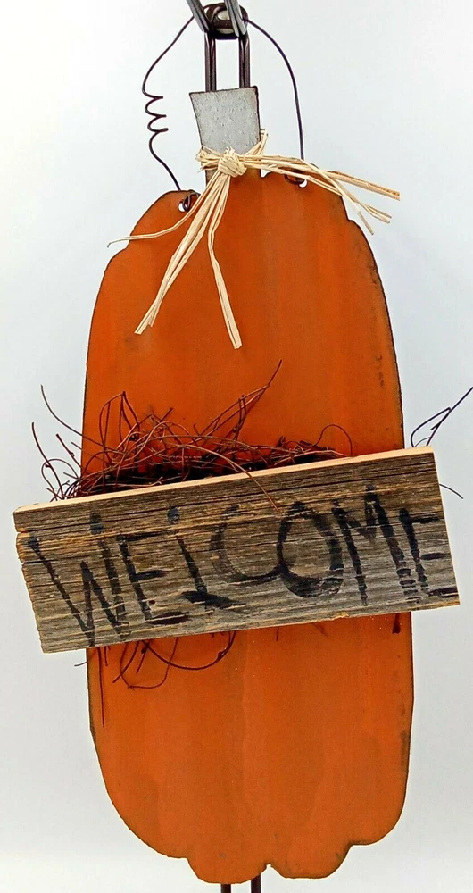 gtin13: Does not apply Material: Metal, Wood, Branches, Paint, Wire, Raffia Color: Orange Finish: Rustic Item Height: 19.5 in UPC: Does not apply Shape: Pumpkin Model: Welcome Sign Personalize: No Style: Farmhouse/Primitive/Rustic/Country Item Width: 10 in Features: Decorative Item Length: 19.5 in Brand: Handmade Pattern: Pumpkin Vintage: No Type: Sign Care Instructions: Easy Care Engraved: No Department: Adults Size: 19.5x10" Customized: No Character Family: Pumpkin Origin: United States Mounting: Door Mounted, Hanging, Wall Mounted Character: Pumpkin Subject: Welcome Product Line: Metal Sign Room: Any Room Additional Parts Required: No Country/Region of Manufacture: United States Theme: Welcome