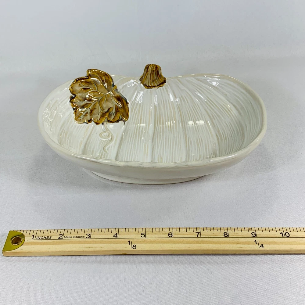 This cream-colored figurine is the perfect addition to your Fall and Thanksgiving decor. The pumpkin shape and leaf design make it a great centerpiece for any table or shelf. Measuring at 10 inches, it is the perfect size for displaying candy, food, or other small items. It is a great gift for any occasion, especially Thanksgiving. We can do combined shipping! See what else you'd like from our store! πRetro and Beyond