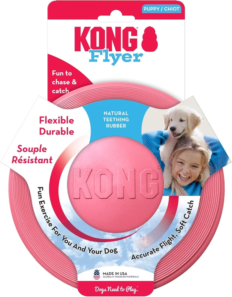 Durable KONG Puppy Rubber: This flying disc is made of forgiving, durable KONG Puppy Natural rubber, ensuring a safe, comfortable catch for your pet Flying Disc Toy with Dynamic Rebound: The KONG Flyer delivers a dynamic rebound if your dog misses the initial fetch, adding an extra layer of fun to playtime Dog Fetch Toy for Healthy Exercise: This puppy chase toy encourages your pet to stay active and supports their natural instinct to play Made in the USA: Globally sourced materials. KONG has been innovating since 1976 to enrich the lives of pets with the highest quality pet toys and treats. Covered by KONG's Satisfaction Guarantee KONG: Since not all toys are created equal, it’s always best to supervise your dog during play. Supervised play will help toys last longer and keep your dog safe. No dog toy is truly indestructible, so always remove the toy from playtime if damaged The Puppy Flyer is perfectly sized for a puppy and made with Kong’s special teething rubber formula for a soft catch. Safety, flexibility, and durability make Kong Flyers the world’s best rubber flying discs. The Puppy Flyer will help you and your puppy exercise.