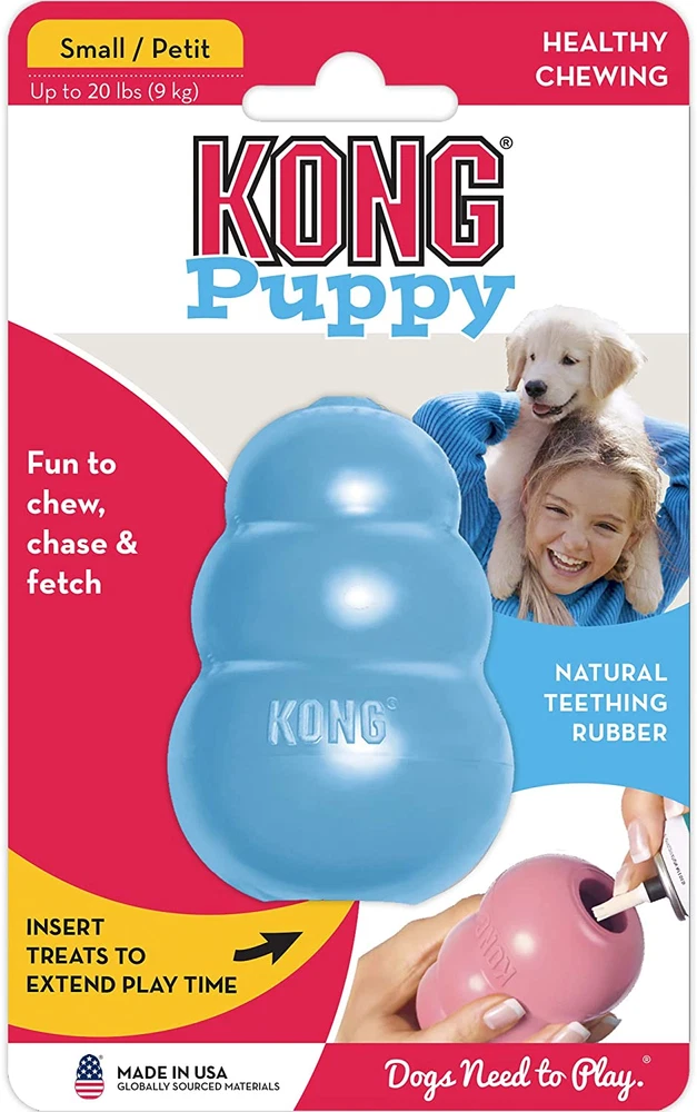 Soft Puppy Rubber: The KONG Puppy is developed with a customized natural rubber for a growing puppy's teeth; it is gentle on their 28-baby teeth, and offers appropriate chewing enrichment Puppy Toy for Playtime: This puppy chew toy also has a bounce that makes it ideal for games of fetch; doubles as a gentle chew toy for a puppy's teeth and gums Make Playtime and Training Last Longer: Stuff this puppy toy with Easy Treat, Snacks, kibble or paste to entice platime, occupy your busy pup, or help make crate training easier Made in the USA: Globally sourced materials. KONG has been innovating since 1976 to enrich the lives of pets with the highest quality pet toys and treats. Covered by KONG's Satisfaction Guarantee KONG: Since not all toys are created equal, it’s always best to supervise your dog during play. Supervised play will help toys last longer and keep your dog safe. No dog toy is truly indestructible, so always remove the toy from playtime if damaged Product Description The Puppy KONG dog toy is customized for a growing puppy's baby teeth, the unique, natural rubber formula is the most gentle within the KONG rubber toy line. Designed to meet the needs of a puppy's 28-baby teeth, it helps teach appropriate chewing behavior while offering enrichment and satisfying a younger pup's instinctual needs while the erratic bounce make it ideal for those pups that just want to play. A stuffed Puppy KONG occupies busy little ones while allowing pet parents the freedom to attend to their unique needs. Want to make crate training easier or extend play time? Be sure to stuff with puppy kibble and a dash of peanut butter. Add to the fun by including KONG Puppy Snacks and top with KONG Puppy Easy Treat. Covered by KONG Satisfaction Guarantee. See KONG Satisfaction Guarantee document below for full details. From the Manufacturer The Puppy KONG dog toy is customized for a growing puppy's baby teeth, the unique, all-natural rubber formula is the most gentle within the KONG rubber toy line. Designed to meet the needs of a puppy's 28-baby teeth, it helps teach appropriate chewing behavior while offering enrichment and satisfying a younger pup's instinctual needs while the erratic bounce make it ideal for those pups that just want to play. A stuffed Puppy KONG occupies busy little ones while allowing pet parents the freedom to attend to their unique needs. Want to make crate training easier or extend play time? Be sure to stuff with puppy kibble and a dash of peanut butter. Add to the fun by including KONG Puppy Snacks and top with KONG Puppy Easy Treat.