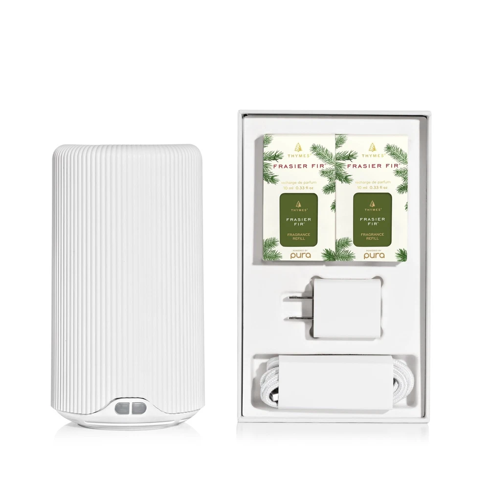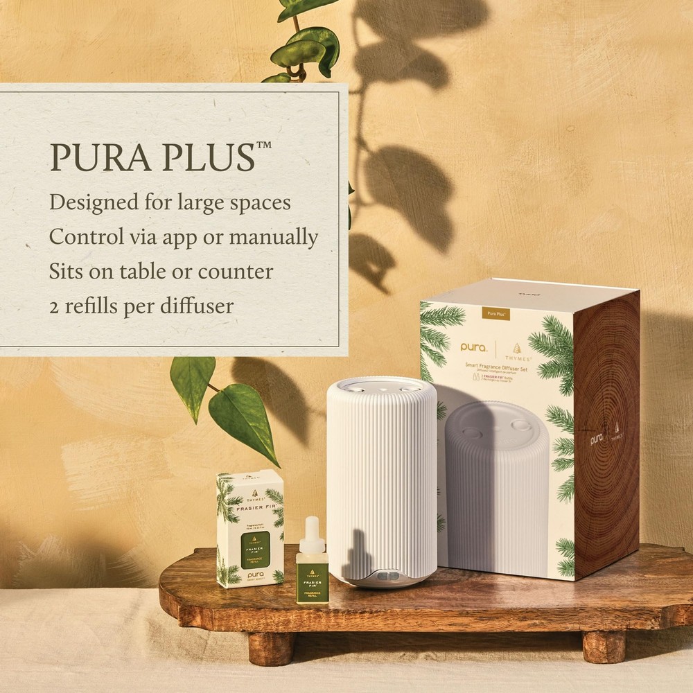 Pura Plus Diffuser Kit - has partnered with Pura to bring iconic Frasier Fir to the next level of home fragrance innovation. The Frasier Fir Pura Plug In Diffuser Kit is a tabletop diffuser designed to sit anywhere in the home. It will fill large, open-concept spaces with fresh notes of Siberian fir, cedarwood, and sandalwood. With improved smart features, easy-access controls through the app, and compatibility with all Pura refills, scenting your home has never been easier. Kit includes 1 Pura Plus Diffuser, a USB-C power cord, and 2 Frasier Fir Pura Scent Refills. Pura Plus Diffuser Kit - has partnered with Pura to bring iconic Frasier Fir to the next level of home fragrance innovation. This tabletop diffuser is designed to sit anywhere in the home. It will fill large, open-concept spaces with the fresh notes of Frasier Fir. This Pura diffuser set includes 1 Pura Plus Diffuser, a USB-C power cord, and 2 Frasier Fir Pura Diffuser Refills. Iconic Frasier Fir Pura Scents - Bring innovative scent technology and fine fragrance to your home with this tabletop Pura oil diffuser. Fill your home with the aromatic snap of Siberian fir, warming cedar, and grounding sandalwood. Improved Smart Diffuser Features - Adjust fragrance intensity, easily switch between fragrances, set schedules and timers, and more—all from the Pura app. Adaptive diffusion technology reads the room's temperature and adjusts according to your preferences. These scent diffusers for home are also pet & eco friendly! Formulated without parabens, phthalates, dichlorobenzene, mineral oil, DEA, petroleum, formaldehyde or propylene. Pura Plus Scent Diffuser - Control your Pura Plus through the Pura app or manually with the buttons right on the aroma diffuser. This device uses 2 Pura refill vials per diffuser. The Pura home fragrance device does require a 2.4 GHz Wi-Fi connection for setup and operation, and it plugs into outlet with a cord. Who We Are - We strive to use natural, plant-based ingredients from renewable and sustainable sources when able. Our own expert chemists develop highly effective formulas without parabens, SLS/SLES, and phthalates whenever possible. Our luxury home fragrance products are always cruelty-free.