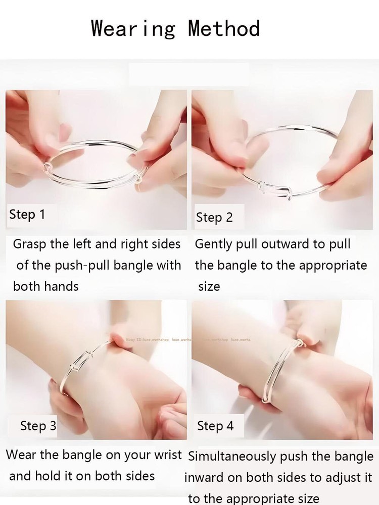 Our picture, description, Unauthorized Use is Strictly Prohibited.---eBay Seller: luxe.workshop SPECIFICATIONS The item Are Made By Pure 999 Silver,it support test Metal:Pure Silver 999(Fine Silver) Bangle Inside Diameter:Adjustable from 56mm (2.20inch) to 60mm (2.36inch) Fit the wrist palm less than (80mm) 3.14inch(measured method A)(as picture) Silver Weight:23-24g Stamp:足银999 If you encounter silver products turning black or yellow, please do not worry. This is due to silver oxidation. You only need to follow the cleaning method on our details How to Choose fit Bangle: Method A:Palm width measurement method: Use a ruler to measure the size of the widest part of the palm joint except for the thumb, and select the wearing size according to the corresponding size in the table. Method B:Perimeter measurement method: Pinch tightly with your five fingers together, use a soft ruler to measure the circumference of the largest part of your hand, and select the appropriate wearing size based on the corresponding dimensions in the table. Wearing Bangle Method: Hold the left and right sides of the bangle with both hands at the push-pull point Gently pull outward to pull the bangle to the appropriate size Put the bangle around your wrist and hold it on both sides Simultaneously push the bangle inward on both sides to adjust it to the appropriate size The function of silver: Silver products can generate a magnetic field within a certain range, releasing a large amount of silver ions. Silver ions have strong bactericidal effects and have health benefits for the human body. It not only has economic value, but also is beautiful and generous. The ancients said that carrying silver will accompany health, wealth, and prosperity, not only because of its precious metal, Medically, it has a higher efficacy on human health than gold. What does 999 silver mean? 999 silver refers to silver products with a silver content of about 99.9%, and a purity of about 99.9% is recognized as pure silver, which is soft and easily oxidized . Why does silver jewelry turn black after wearing it for a long time? The blackening of silver jewelry worn is a normal oxidation. Because silver reacts chemically with sulfur in the air over a long period of time to produce black silver sulfide, it can cause silver jewelry to gradually turn black. How to deal with blackened silver jewelry? You can try using a drawing eraser to wipe away the slight black oxide on the surface of the silver jewelry. You can try applying a small amount of toothpaste on the surface of the silver jewelry, then using a toothbrush dipped in warm water to scrub, and finally drying it with a full wool soft cloth. When the surface of silver jewelry shows slight discoloration due to mild corrosion, it can be gently wiped with detergent or hot medium-sized soap. First, use a soft bristled brush to wash, and then dry with full wool soft cloth. At this time, the silver jewelry will show its original brightness. Wash the silver jewelry by heating it with laundry detergent and boiling water to form a solution, then wet the surface with phosphoric acid solution and wipe it with a cloth to make it cleaner. When silver jewelry oxidizes, it presents a light coffee color. It can be wiped with a soft cloth dipped in a little silver oil, soaked in silver washing water, or directly wiped with a silver cloth. Soak the silver jewelry in silver washing water for a while, then take it out and rinse it with clean water. Thai Silver Maintenance: The best maintenance method for Taiyin is the same as jade, which is to wear it every day. The natural oil produced by the human body can keep Taiyin jewelry warm and shiny. (Of course, there are exceptions. Some people's sweat contains ingredients that can turn silver black.) When not wearing it, it is important to pack it in a closed bag to prevent the surface of the silver jewelry from oxidizing and turning black when exposed to air Daily cleaning method: Put some toothpaste on the silver jewelry, add some water, rub it appropriately until small bubbles appear, and then rinse with clean water to restore its shine. When wearing silver jewelry, do not wear other precious metal jewelry at the same time to avoid collision, deformation or abrasion. Do not wear while taking a shower, as some cleansers and shampoos contain alkaline ingredients that can oxidize and corrode Thai silver; Do not wear it when swimming, especially when swimming in seawater or soaking in hot springs. Wearing silver jewelry requires regular cleaning. When wiping silver jewelry, a soft cloth, preferably a professional one, should be used. Silver wiping cloth contains maintenance ingredients and cannot be washed with water. The difference between pure 999 silver and Thai silver 925: The natural color of pure silver jewelry is generally yellowish. In order to float, chemical plating is used to coat a layer of silver on the surface of pure silver, which is a bright white color. Some pure silver surfaces are not coated with bright silver using chemical plating methods. This type of pure silver tends to be yellowish, revealing the natural color of silver, which is beige. Thai silver, Its craftsmanship comes from Thailand. In terms of material, it is 925/990 pure silver, which is a special term for a vintage and special craftsmanship. Also known as' Wuyin '. Due to special anti-aging treatment, black silver jewelry not only does not change color for a long time, but also greatly enhances its surface hardness. The unique texture and color make this jewelry rough and rustic. SHIPPING POLICY Our All Items Will Be Dispatched Within 1-5 Business Day By Airmail After The Payment Is Clear. . Generally You Will Receive Your Order Within 10-45 Business Days After We Dispatched Your Package To The Delivery Company. We Cannot Guarantee The Delivery Timeframe If The Post Office Has Any Unexpected Delays Due To Holiday, Weather, Customs, Or Other Conditions. Please Choose Some Local Sel