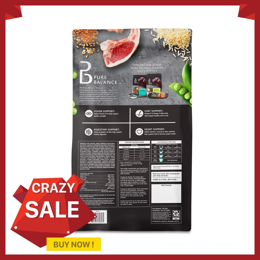 Pure Balance Lamb & Brown Rice Recipe Dry Dog Food, 15 lbs Added vitamins, minerals, and other trace nutrients Omega-6 and Omega-3 fatty acids help support healthy skin and coat Follow the convenient feeding instructions listed on the back of the packaging to ensure your dog is receiving the appropriate amount for their size during feeding times