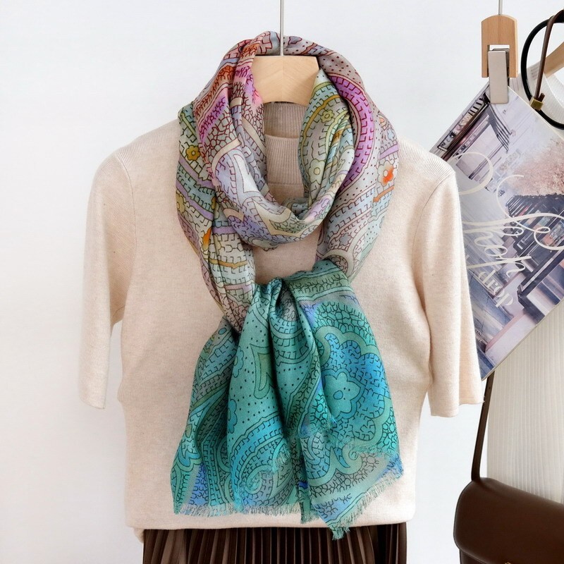 $ 9.19Double-Sided 100% Silk Vintage Green Floral Striped Long Scarf 150x15cm for Women