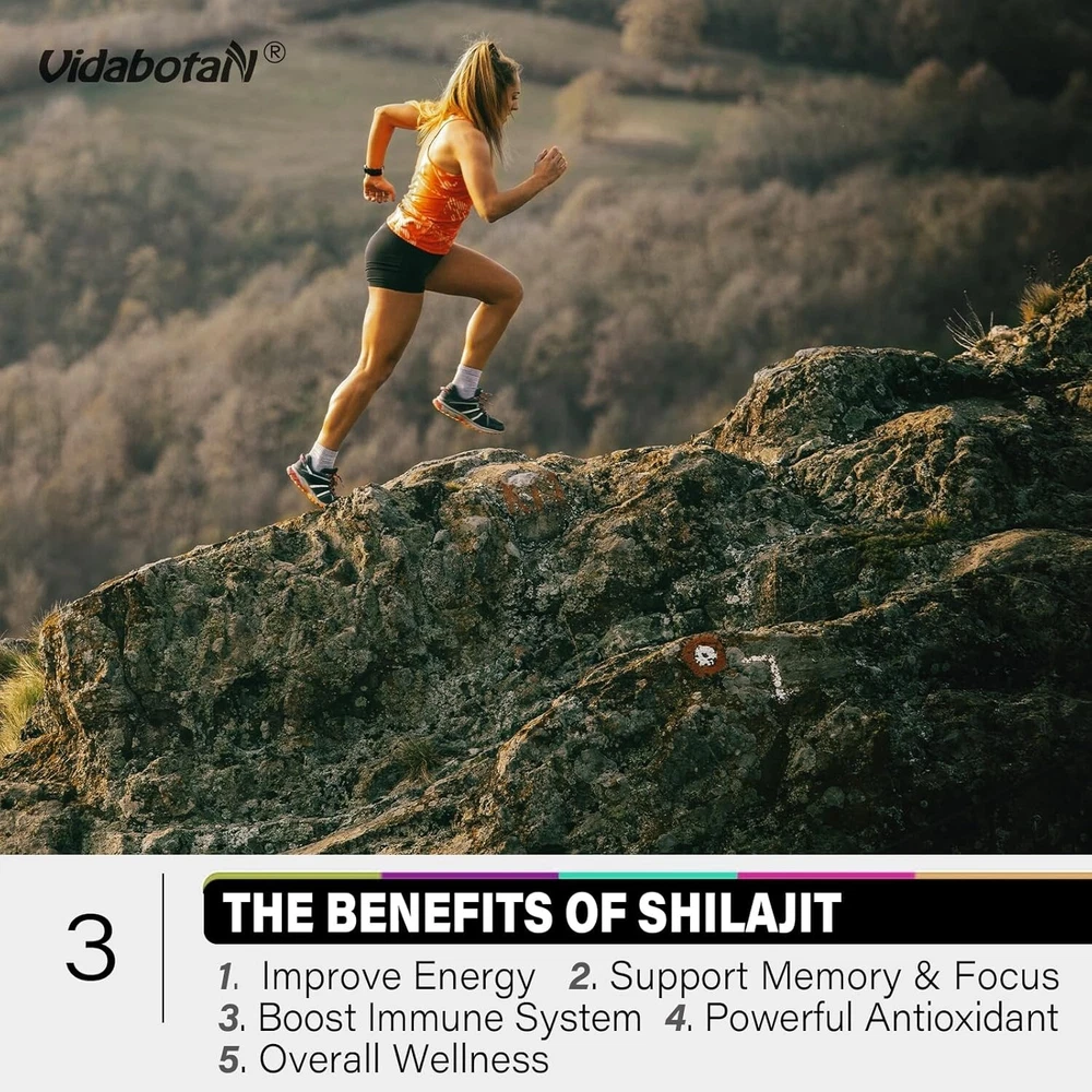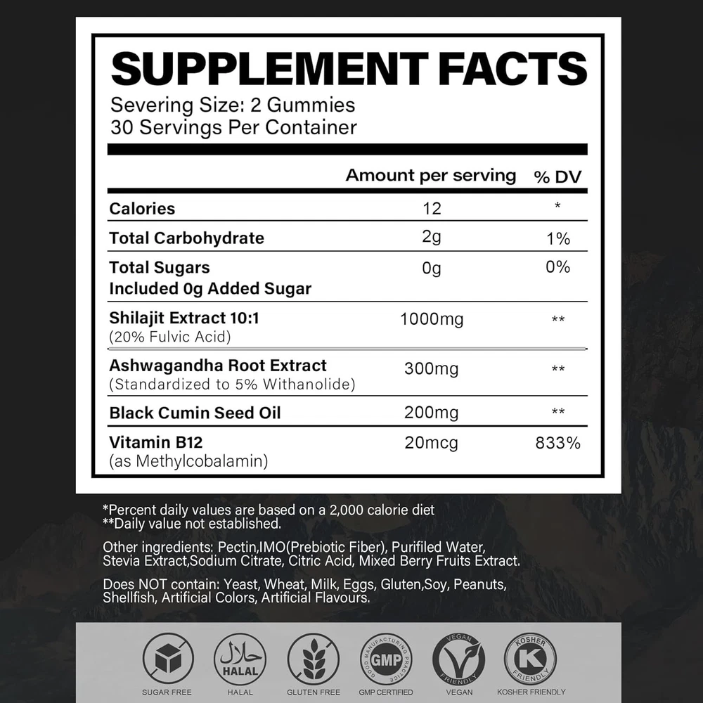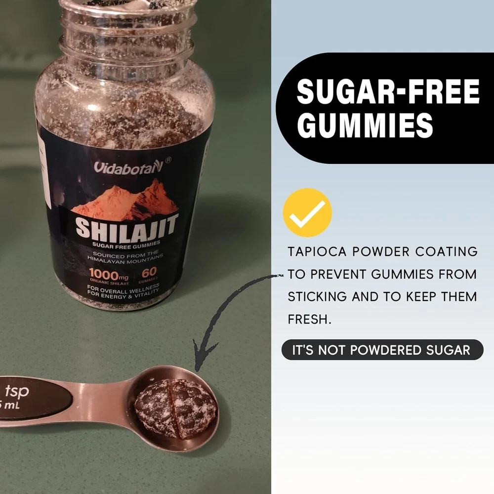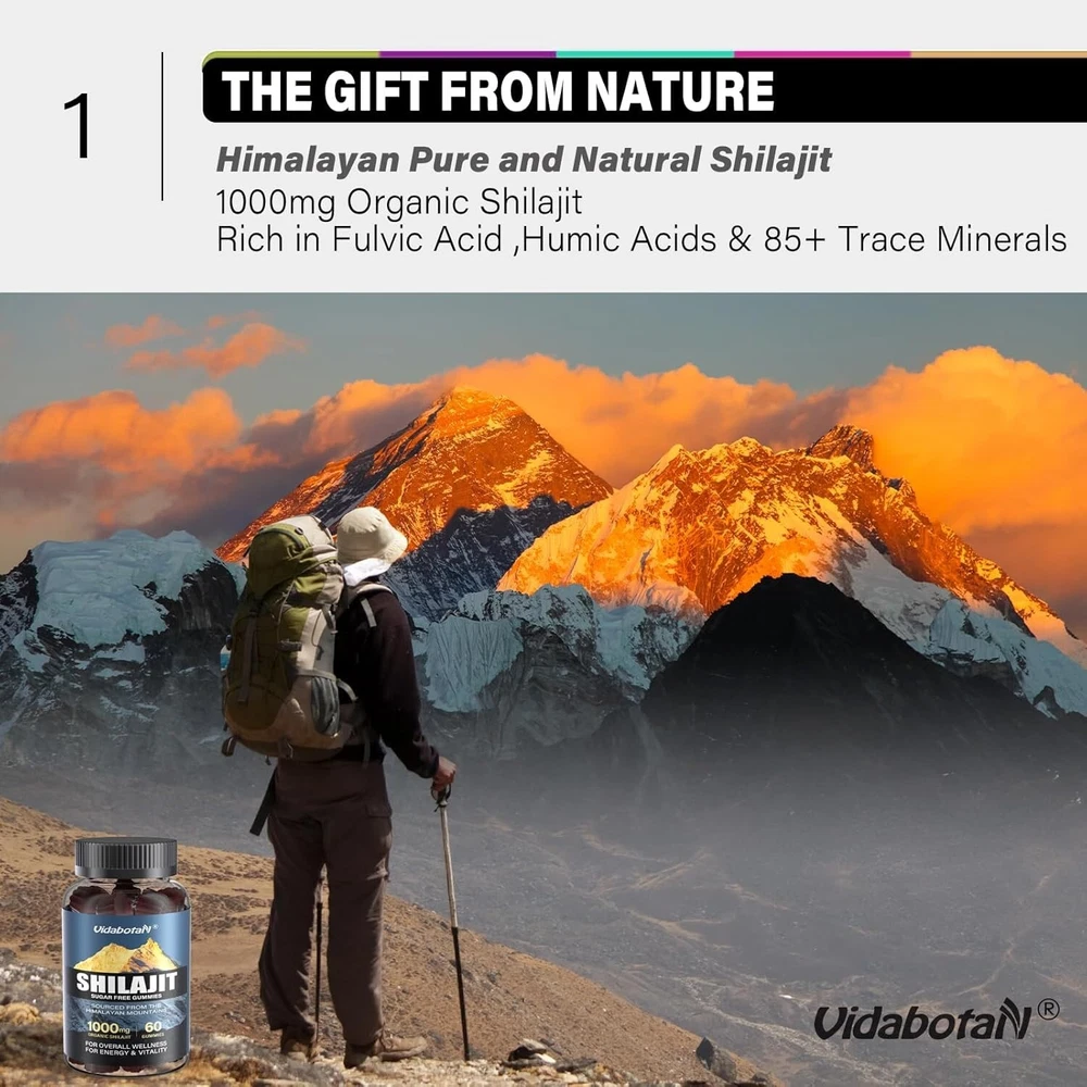 Himalayan Shilajit Gummies, Organic, Extremely Potent 1000 mg, 60 Gummies (PACK OF 1) Sugar Free Shilajit Gummies 1000mg – Pure Shilajit Supplement for Men & Women – 85+ Trace Minerals & Fulvic Acid with Ashwagandha- Energy, Brain, Immunity –Mixed Berry Flavor,60 Gummies [Powerful Blend]: Our Shilajit gummies contains 1000mg Purified Shilajit per serving combined with 300mg Aswagandha, 200mg Black Seed Oil and Vitamin B12 for Maximum Benefits. [Energy & Vitality Support]: Our Shilajit gummies help promote natural energy and vitality, giving you a balanced boost to keep you feeling refreshed and active throughout the day [Cognitive & Immune Support]: With the powerful combination of Shilajit, Ashwagandha, and Black Seed Oil, our gummies help maintain focus while supporting a strong immune system for daily wellness. [Delicious & Convenient]: Our Shilajit gummies taste great, are easy to chew, non-sticky, and serve as a perfect alternative to Shilajit capsules, Shilajit resin, and other Shilajit supplements. [Premium Quality]: Vidabotan shilajit gummies are 100% vegan, gelatin-free, and Sugar-free, free from artifical additives, All of our gummies are manufactured, tested and bottled in a GMP certified factory for the superior quality and consistency. Note: This Product is designed to deliver optimal results, offering high-quality performance and satisfaction. Please note that individual experiences and outcomes may vary based on personal use, preferences, and unique circumstances. For best results, we recommend following the provided guidelines and ensuring the product is used as intended. Product result may vary for every individual.