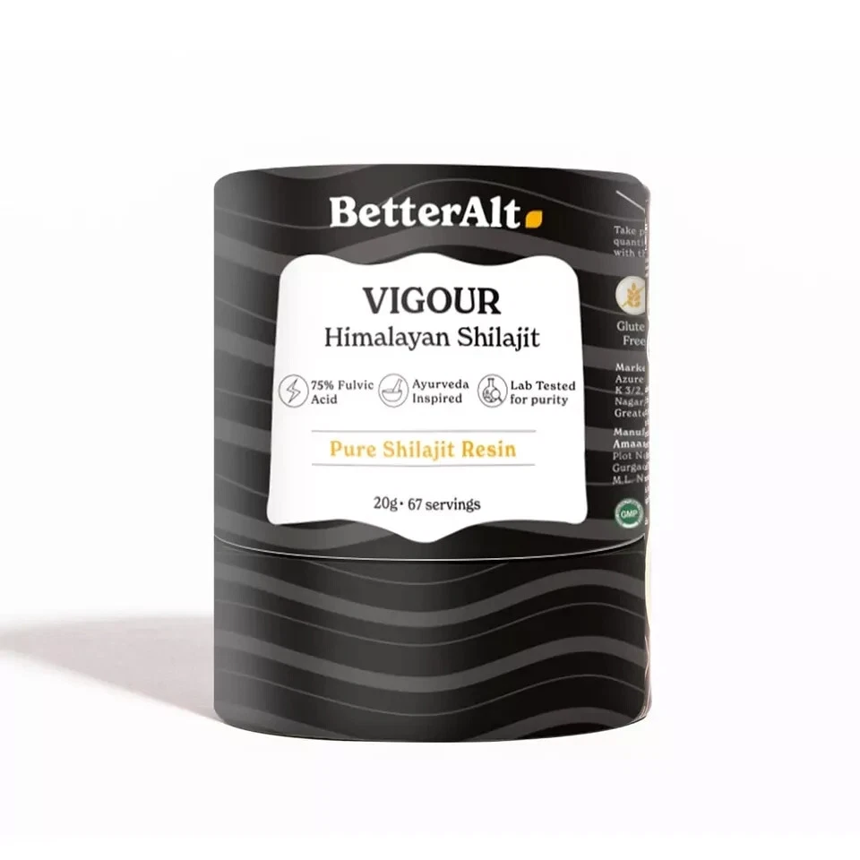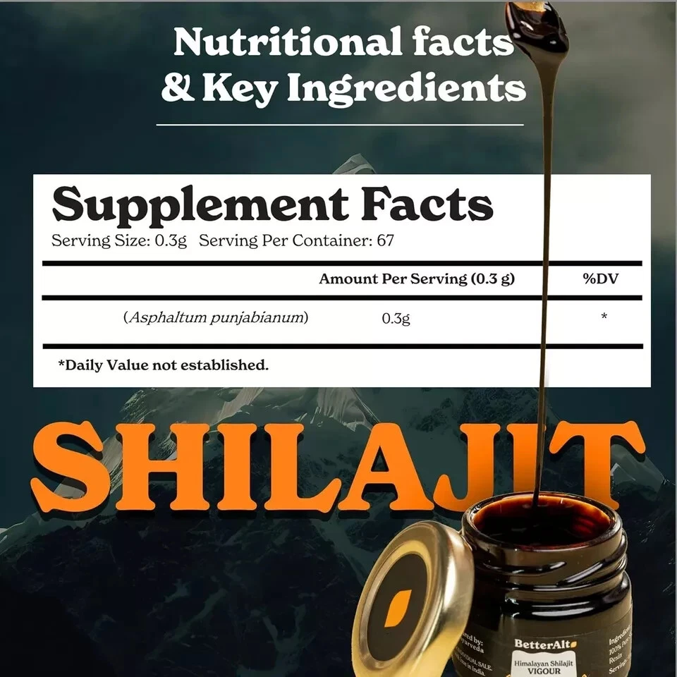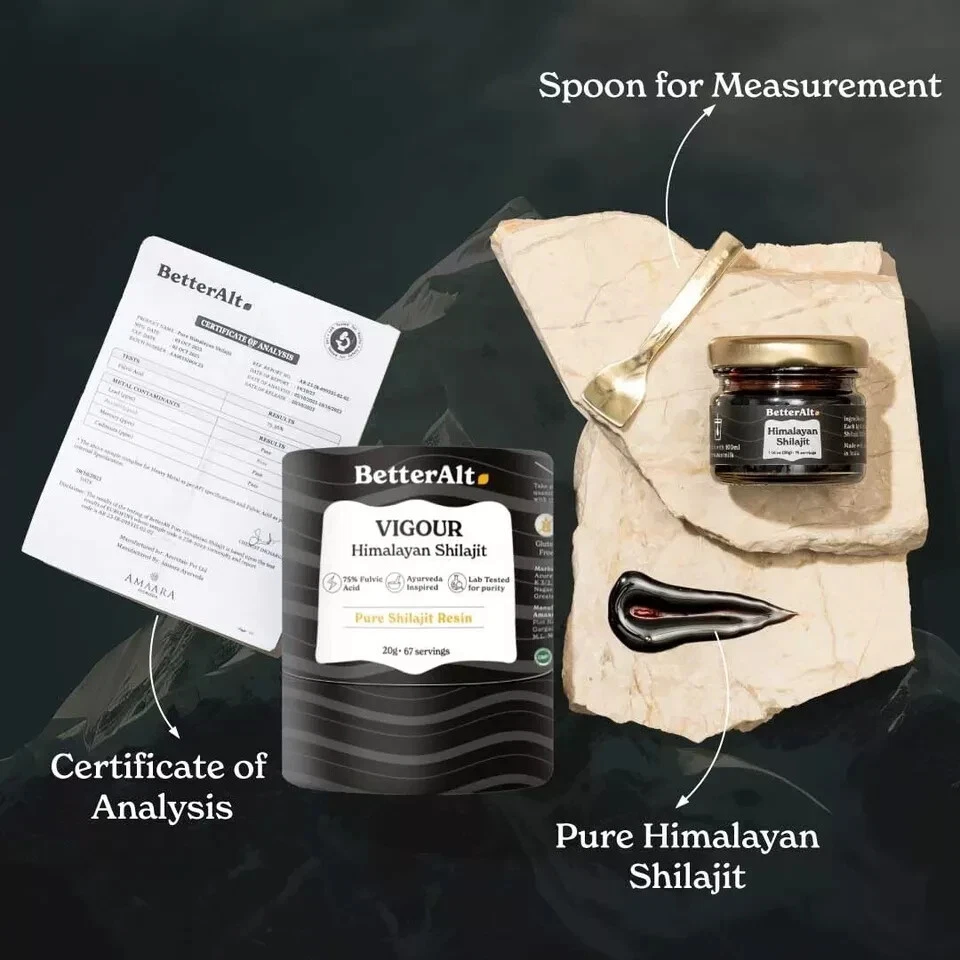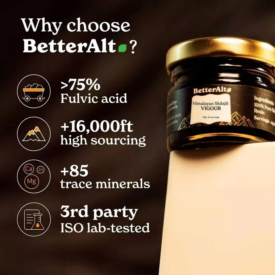 BetterAlt Pure Himalayan Shilajit Resin - High Potency for Men & Women | 67 Servings | Energy & Immune Support Unlock the power of Pure 100% Himalayan Shilajit with BetterAlt’s Soft Resin , crafted from premium, organic Shilajit straight from the Himalayan mountains. This extremely potent Shilajit resin is rich in 85+ trace minerals and over 75% fulvic acid, giving it unparalleled benefits for energy, immunity, and overall vitality. Formulated for both men and women, each serving delivers a concentrated dose to help boost energy levels, improve immune support, and enhance stamina naturally. Our Himalayan Pure 100% Shilajit is lab-tested for purity and potency, ensuring a safe and effective product that meets the highest standards. This organic soft resin is available in a convenient 2-pack format, providing you with 67 servings per jar of pure, high-potency Shilajit. Ideal for those seeking a natural way to support their wellness journey, each dose of this Shilajit resin offers potent benefits thanks to the high fulvic acid concentration that aids in mineral absorption and cellular rejuvenation. Key Benefits: Pure & Organic : Sourced from the pristine Himalayan region for the finest quality. High Fulvic Acid Content : 75%+ for enhanced mineral absorption and health support. Energy & Immunity Boost : Provides sustained energy, immune support, and vitality for both men and women. Lab-Tested : Verified for purity and potency with full lab test reports included. Elevate your wellness routine with BetterAlt Pure Himalayan Shilajit Resin , offering you the power of nature’s purest Shilajit in an organic soft resin form that is potent, safe, and effective.