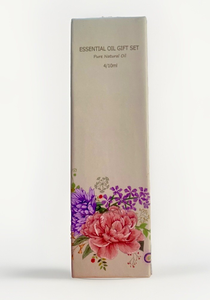 A lovely gift set of Pure, Natural ESSENTIAL Oils! 4 10 ml glass bottles of oil packaged in a decorative box. Therapeutic Grade oils Eucalyptus Bergamot Rosemary Lavender