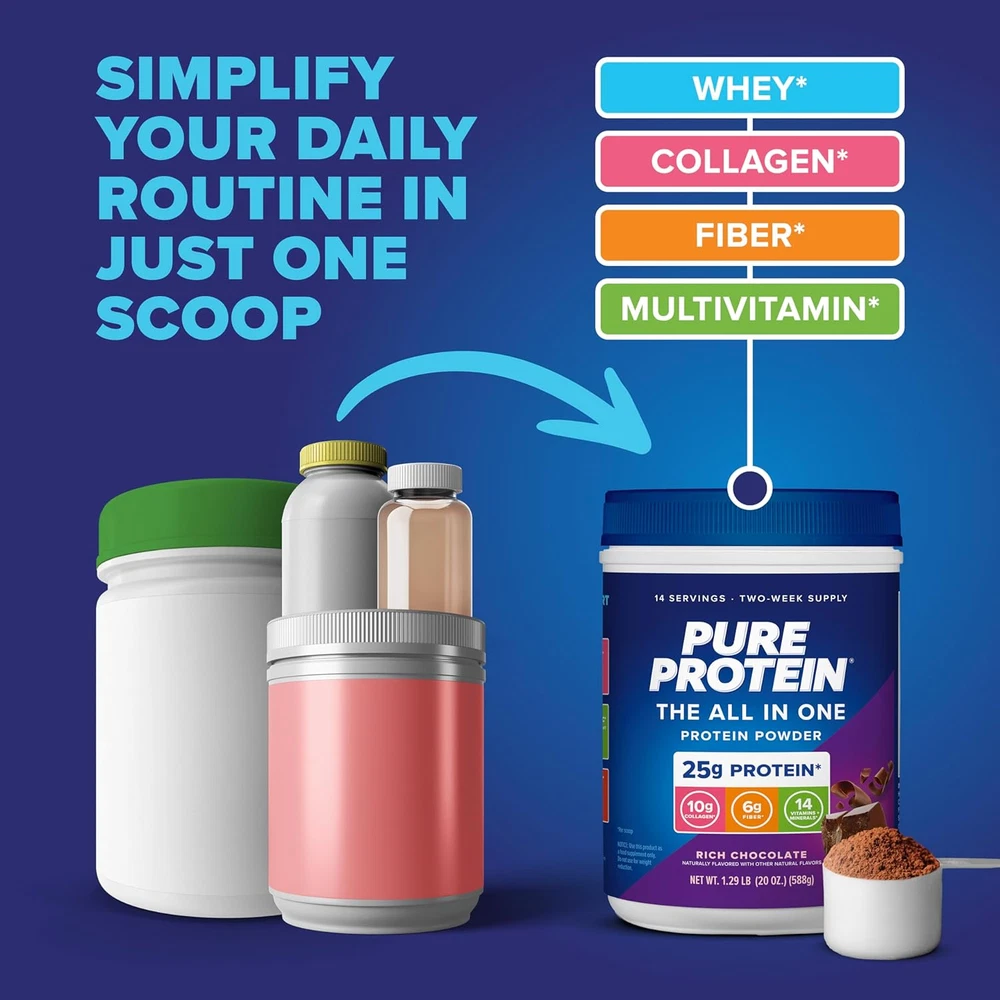 Store New Arrivals Add to Favorite View Feedback Contact Pure Protein All-In-One Powder, Rich Chocolate - Whey & Collagen, High Fiber, Vitamins, No Added Sugar, Non-Gmo, Gluten-Free, 1.25Lb Description Unit Count 20.0 Ounce Number of Items 1 Brand Pure Protein Package Weight 0.72 Kilograms Flavor Name All-in-one Flavor All-in-one Package Dimensions 7.05 x 4.92 x 4.84 inches; 1.59 Pounds Manufacturer Pure Protein The Pure Protein All in One Protein Powder is a game-changing formula designed to simplify your daily nutrition with ingredients to help support lean muscle, skin, joints, and digestive health. Our blend of 15g whey protein, 10g collagen, 6g fiber, and 14 vitamins and minerals give you the everyday boost you need in one simple scoop. Delicious in a smoothie to start your day, or simply shake and enjoy post-workout. It's nutrition made easy, giving you more time to do what you love. Third Party Tested ABOUT US We offer the best prices around on high quality products. Our E-store includes media such as books, movies, music and games while offering electronics, toys, sporting apparel, clothing, tools, general home, garden items and more. SHIPPING We are always working hard to ensure your package arrives as soon as possible. Please understand that some factors like weather, high postal traffic, and the performance of shipping companies are outside of our control. We offer free shipping to the lower 48 states and ship within 2 business days of payment, usually sooner. We do not accept P.O. Boxes. Please provide a physical address. RETURNS We offer a 30-Day Return Policy on items which you are not completely satisfied with. You have the option for a full-refund or an exchange of the item. No returns are available on items shipped outside of the USA. PAYMENT We accept PayPal. CONTACT US This page content is yet to come Please ad us to your favorite seller and visit again later Thank You CUSTOMER SATISFACTION We try our very best to make sure every customer is completely satisfied. If there's a problem, message us! We're happy to help.