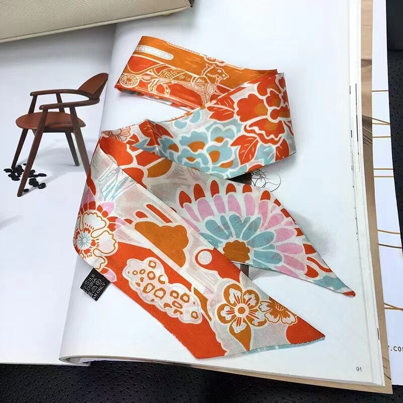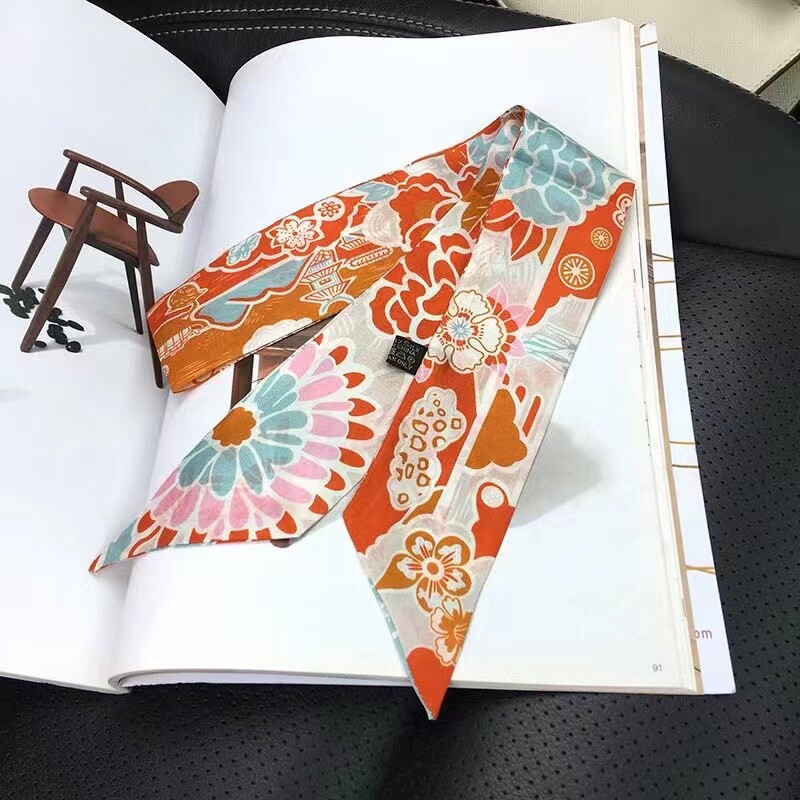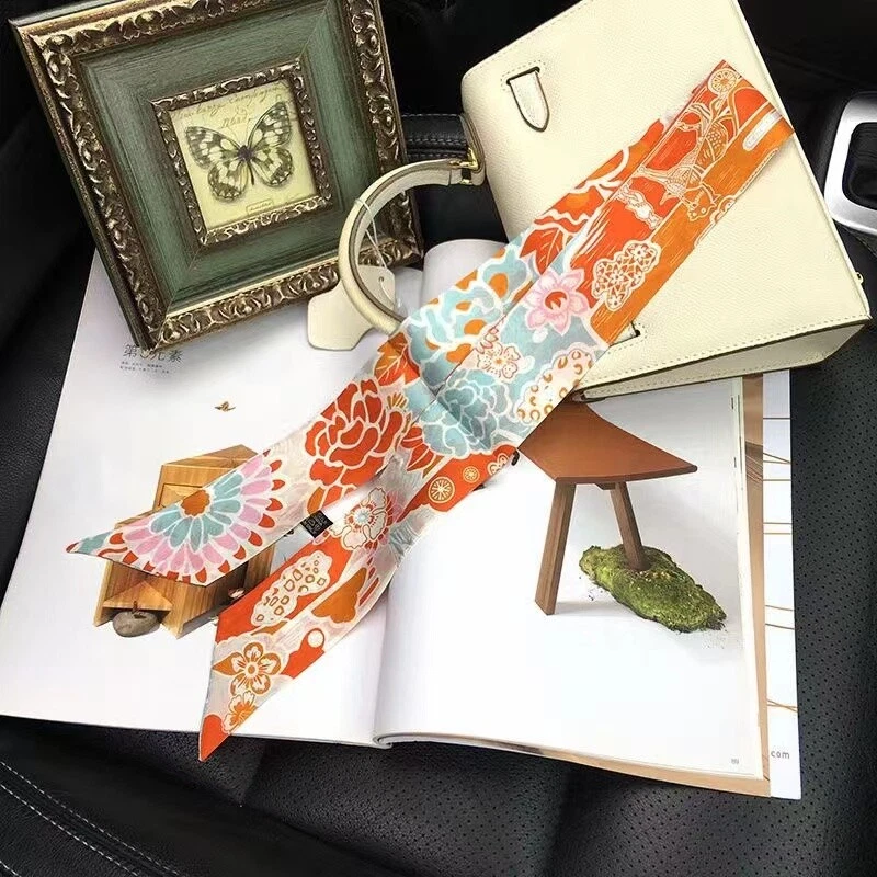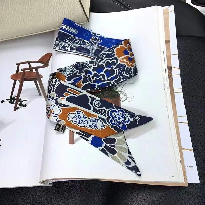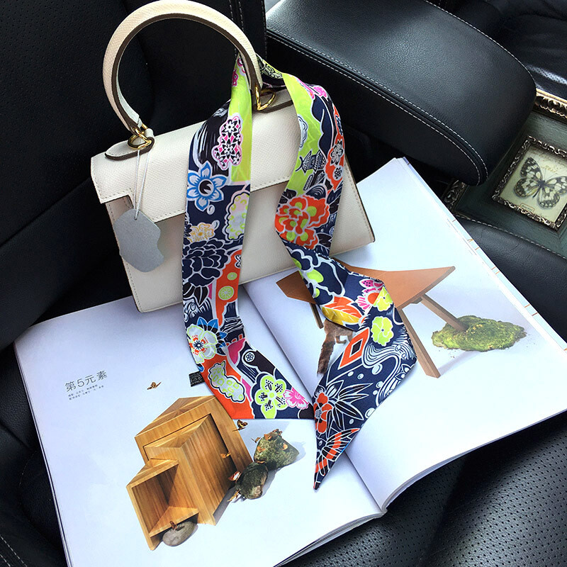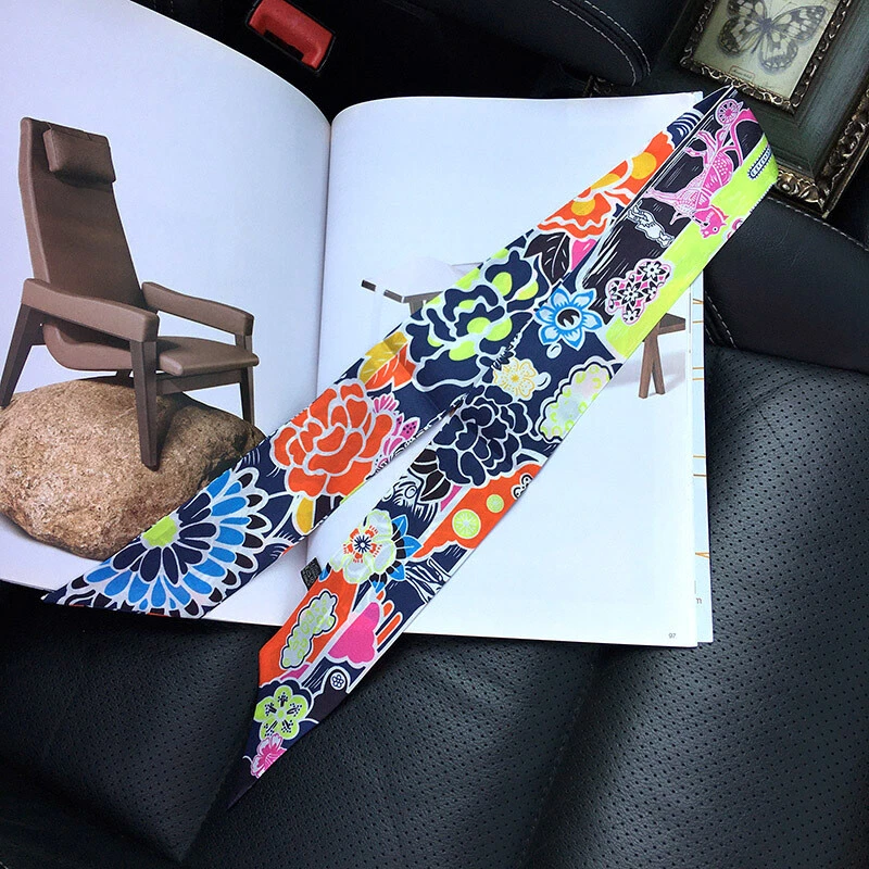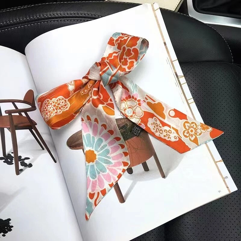 Pure Silk Scarf with Ribbon Flower Print Fashionable Headband or Neck Tie 86x5cm