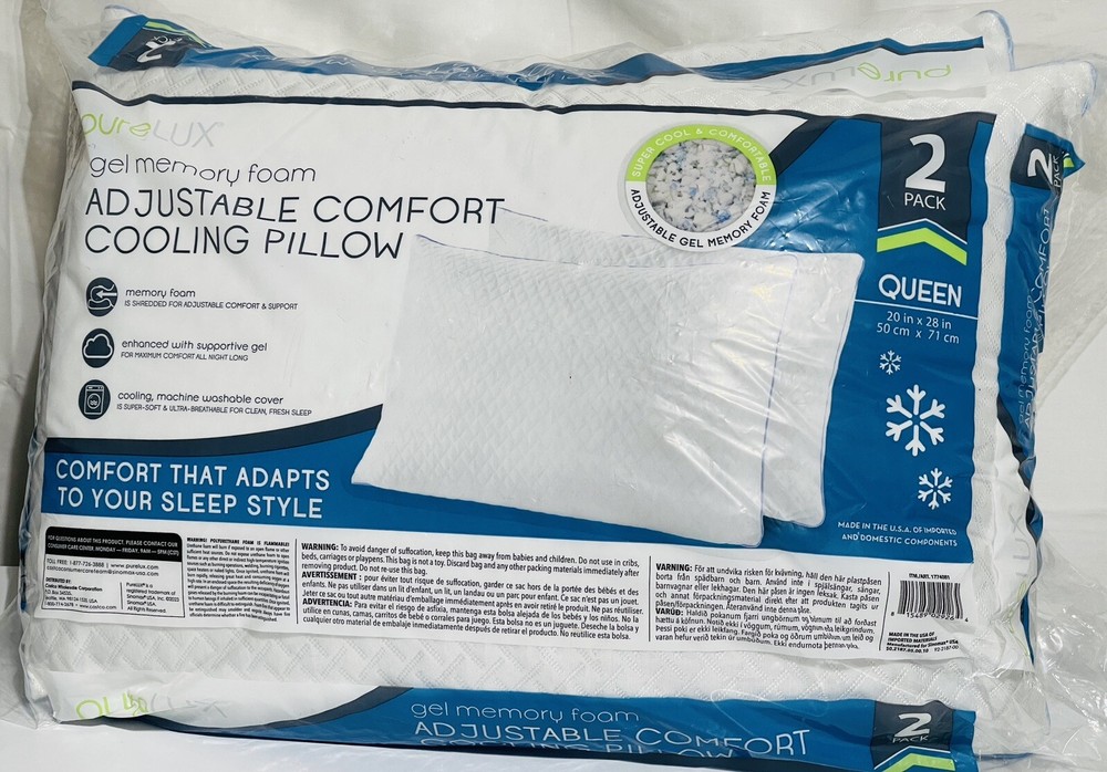 PureLUX Gel Memory Foam Adjustable Comfort Pillow Queen , NEW WITHOUT TAG - OPEN BOX - CUSTOMER RETURN FROM WHOLESALE CLUB - EXCELLENT CONDITION FREE SHIPPING The PureLUX Gel Memory Foam Adjustable Comfort Pillow is a luxurious foam pillow that comes in a pack of two. The pillow is made of memory foam and gel foam fill material, which provides a comfortable sleeping experience. The pillow is rectangular in shape and measures 20 inches by 28 inches. It is adjustable to provide personalized comfort. The pillow is white in color and has a luxury theme. It is designed for use in the bedroom and is made in the United States.