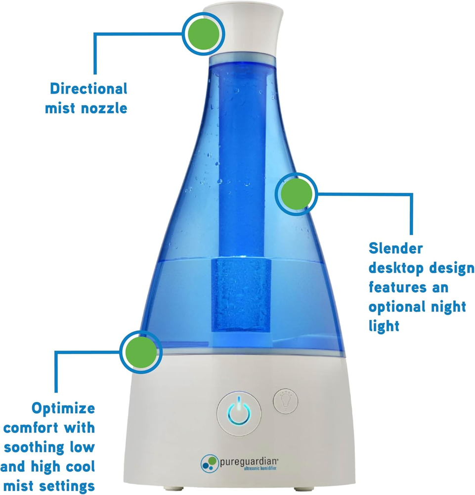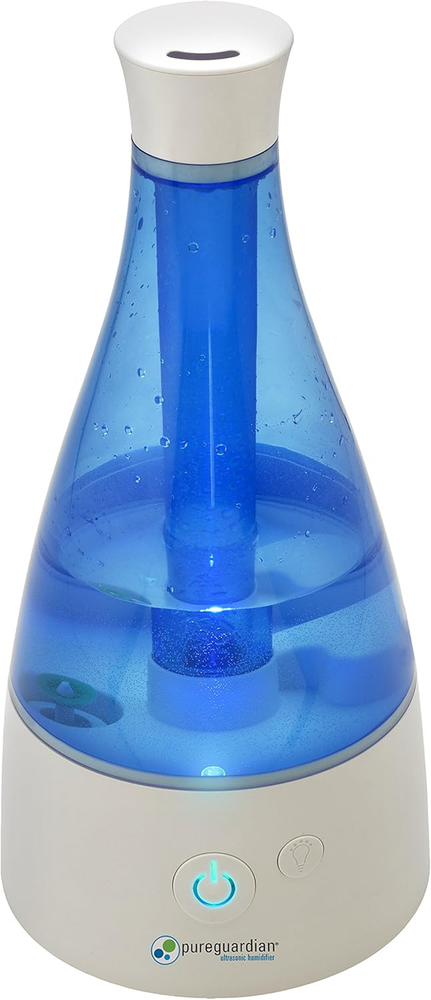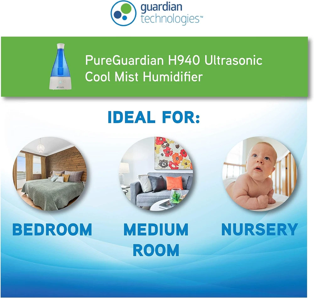 COOL MIST HUMIDIFIER: The PureGuardian H940 AR ultrasonic cool mist humidifier guards against dry air in the home, perfect for those with colds, allergies and dry skin. The easy to fill 0.5 gallon tank is ideal for 350 sq. ft. rooms and runs up to 30 hours on low SILVER CLEAN PROTECTED TANK: Silver Clean technology helps to keep the humidifier tank cleaner longer AROMATHERAPY TRAY: The aromatherapy tray option helps create a relaxing environment with your favorite essential oil. Oils are not included. Create a better home environment and optimize your comfort with an ultra-quiet, soothing cool mist ADDITIONAL FEATURES: This table top humidifier has a low water indicator light which lets you know when to refill the tank. The night light feature makes it a great addition to kid's rooms. Multi-directional mist, automatic shut-off when tank is empty PureGuardian: by Guardian Technologies offers a full range of small appliance-based solutions for happier and healthier lives at home, focused on creating powerful, safe and innovative technologies to help facilitate healthier, happier home environments The 30-hour* Ultrasonic Cool Mist Humidifier guards against problems caused by dry air in the home. It features an easy to fill .5 gallon tank, ideal for use in small sized rooms. Unlike other humidifiers that grow slimy mold on the water tank surface, Silver Clean™ is embedded in the tank to to help keep the tank cleaner longer. Thanks to ultrasonic technology, it disperses a fine mist into the air, and is ultra-quiet making it ideal to have on while you sleep. This table top humidifier has an optional aromatherapy tray so a few drops of essential oil can be added to create a relaxing atmosphere. The humidifier emits a soothing cool mist, and a low water indicator light lets you know when it’s time to refill the water tank. Night light feature makes it a great addition to kids’ rooms. PureGuardian® humidifiers create a better home environment for those suffering from colds, allergies and dry skin. Note: Run time is based off of running the unit on low speed, also depends on atmospheric conditions.