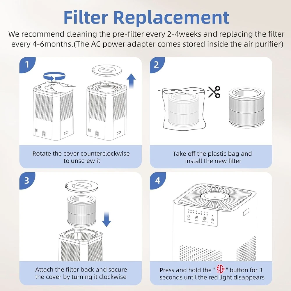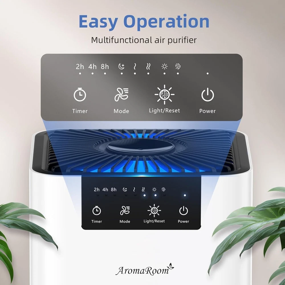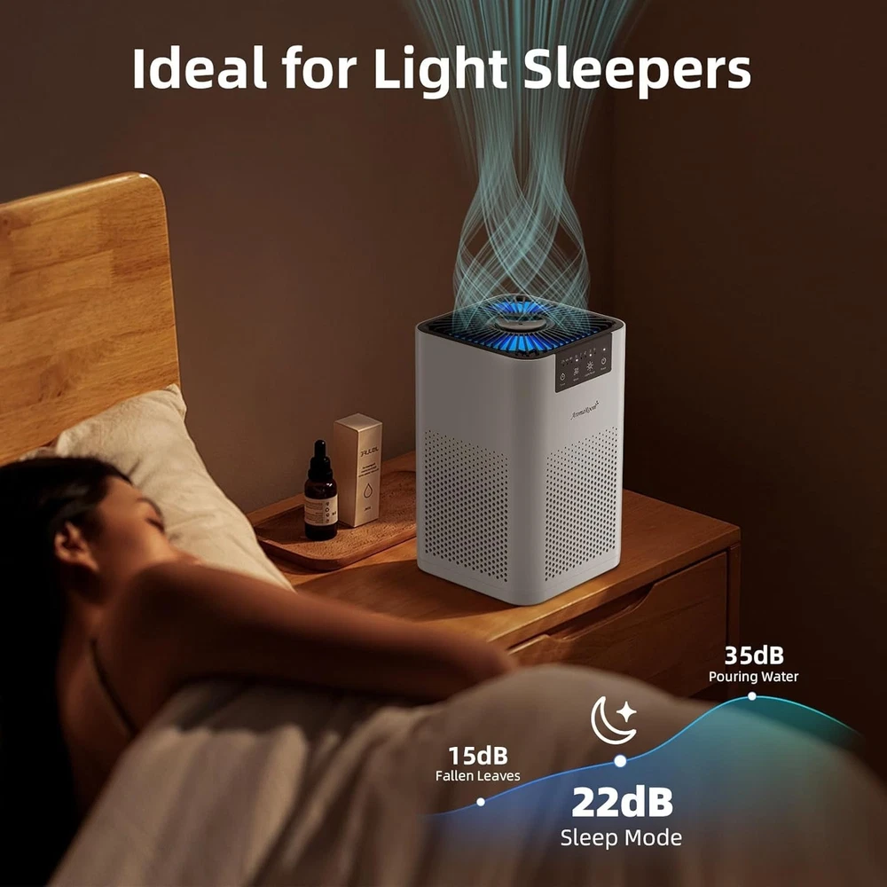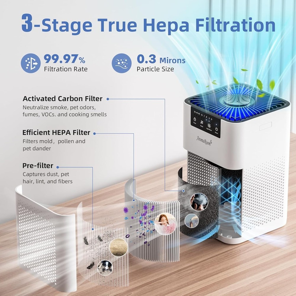 High Recirculation Rate: With turbocharging and special air outlet design, AromaRoom Air Purifier can purify 157 sq. ft./15㎡ of air twice per hour, covering every corner of the room with fresh air in a short period of time Super Purification: True HEPA 13 air purifier adopts a 3-stage high-efficiency filtration system that captures up to 99.97% of fine particulate matter down to 0.3 microns in size, effectively filters smoke, pollen, pet dander, odors Sleeping Partner: Bedroom Air Purifier utilizes magnetic levitation brushless motor technology, which allows the machine to operate with low noise. In sleep mode, the noise level is as low as 22dB, which efficiently purifies the air in the room while keeping it quiet Relax with Fragrance: Add a few drops of fragrant essential oils (not included) to the aroma pad to keep your room smelling great