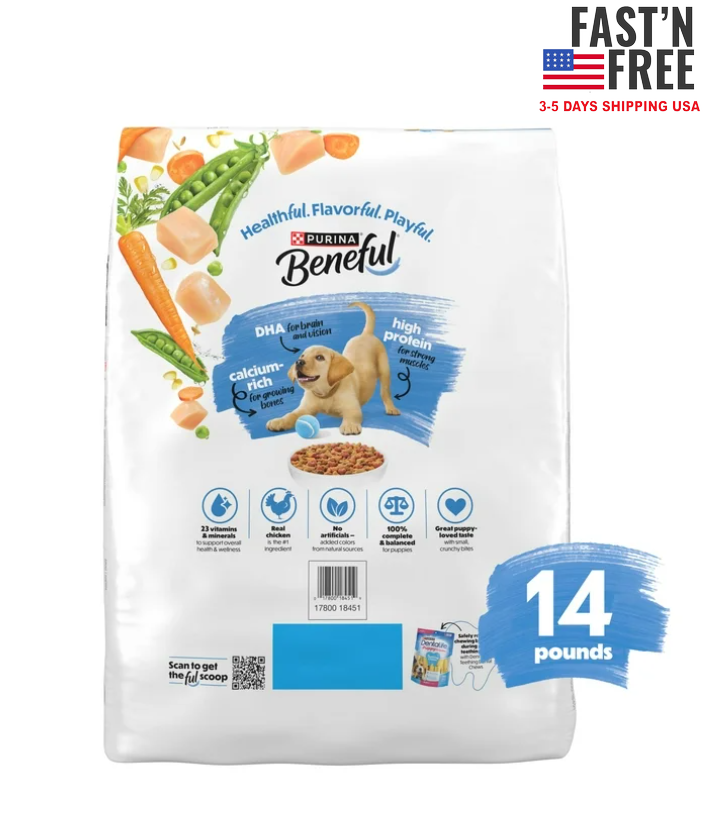 Purina Beneful Healthy Puppy with Farm-Raised Chicken, 14 lb Bag US Warehouse - FREE & FAST Shipping SALE!!! DESCRIPTION: Choosing the right puppy food won’t just give your puppy the nutrition they need to grow, but it will fuel their daily adventures, which is why your puppy needs Purina Beneful Healthy Puppy With Farm-Raised Chicken, Natural High Protein Dry Puppy Dog Food Formula With Added Vitamins, Minerals and Nutrients. This natural Purina dry puppy food recipe has everything a growing puppy needs, whether it’s a generous 29 grams of protein in each cup to help them develop strong muscles, 23 essential vitamins and minerals to support overall wellness, calcium for strong teeth and bones or DHA to aid brain and vision development in the puppy stage. Featuring delicious farm-raised chicken as the number 1 ingredient, this high protein dog food for puppies also includes accents of peas and carrots to make mealtime that much more flavorful and nutritious. Unlike other dog food brands, Purina Beneful dog food is made without artificial flavors or preservatives, so your growing puppy will only get the wholesome nutrition he needs as he grows and nothing he doesn’t. Make sure you’re giving your puppy the 100 percent complete and balanced nutrition delivered in this Purina Beneful dog food for puppies and see the joy in their eyes each time you fill their bowl with this delicious puppy dog kibble. Each bag of Purina Beneful Healthy Puppy With Farm-Raised Chicken, Natural High Protein Dry Puppy Dog Food Formula With Added Vitamins, Minerals and Nutrients is proudly produced and tested for quality and safety in Purina-owned facilities. Healthful. Playful. Beneful. Purina Beneful Healthy Puppy Farm Raised Chicken, 14lb Bag Real farm-raised chicken is the number 1 ingredient in this dog kibble that provides a naturally delicious taste with no artificial flavors or preservatives Beneful dry dog food with calcium-rich nutrition to help support strong bones and teeth, and DHA to support healthy brain and vision development Bite-size Purina puppy food is sized for their small puppy mouth and manufactured with accents of real peas and carrots Healthy Purina Beneful dog food for puppies contains 29 grams of protein per cup for strong muscles, and 23 essential vitamins for dogs and minerals help support overall health Chicken dog food with added vitamins, minerals and nutrients offering 100 percent complete and balanced nutrition for puppies and no artificial preservatives or flavors Animal lifestage Puppy Pet food flavor Chicken Meat type Chicken Pet food condition Dry Product line Healthy Puppy Weight 14 lb Animal health concern Brain Health, Bone Health, Energy & Vitality Support, Immune Support, Eye Care, Muscle Support Brand Beneful Pet food form Kibble Shelf life 365 days Manufacturer Nestlé Purina PetCare Company SHIPPING: It takes about 3- 6 business days for delivery for USA order , Business days exclude weekends and holidays We do not ship to warehouse addresses RETURN & EXCHANGE: We stand behind the quality of our products and guarantee our workmanship 100%. Any defects or errors on our part will result in a replacement at no charge. We typically do not accept returns due to user error such as incorrect selection of sizes, designs, colors, etc. We just can accept return for damage or bad printing result, wrong size and design from us Therefore, if there are any issues about the item, please do not leave negative/neutral feedback, please contact us and give us an opportunity to resolve the problem first Before opening a return case on eBay, please contact us with the reason for return and send us proof like the picture, it will be easier for us to handle your problem. If you were pleased with this transaction, it is really appreciated to give us positive feedback, thanks! CONTACT US: If you have any question, feel free to contact us. We endeavor to respond within 24 hours. If you are not satisfied, please contact us immediately. We will do our best to resolve your concern FEEDBACK: If you are happy with your purchase, PLEASE take a moment to leave Positive feedback for us. We really appreciate that. If you are not happy with the purchase, PLEASE contact us to resolve the problem. We are always here to give you the best solutions. THANK YOU SO MUCH GOD BLESS YOU AND FAMILY!!!