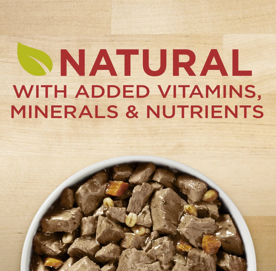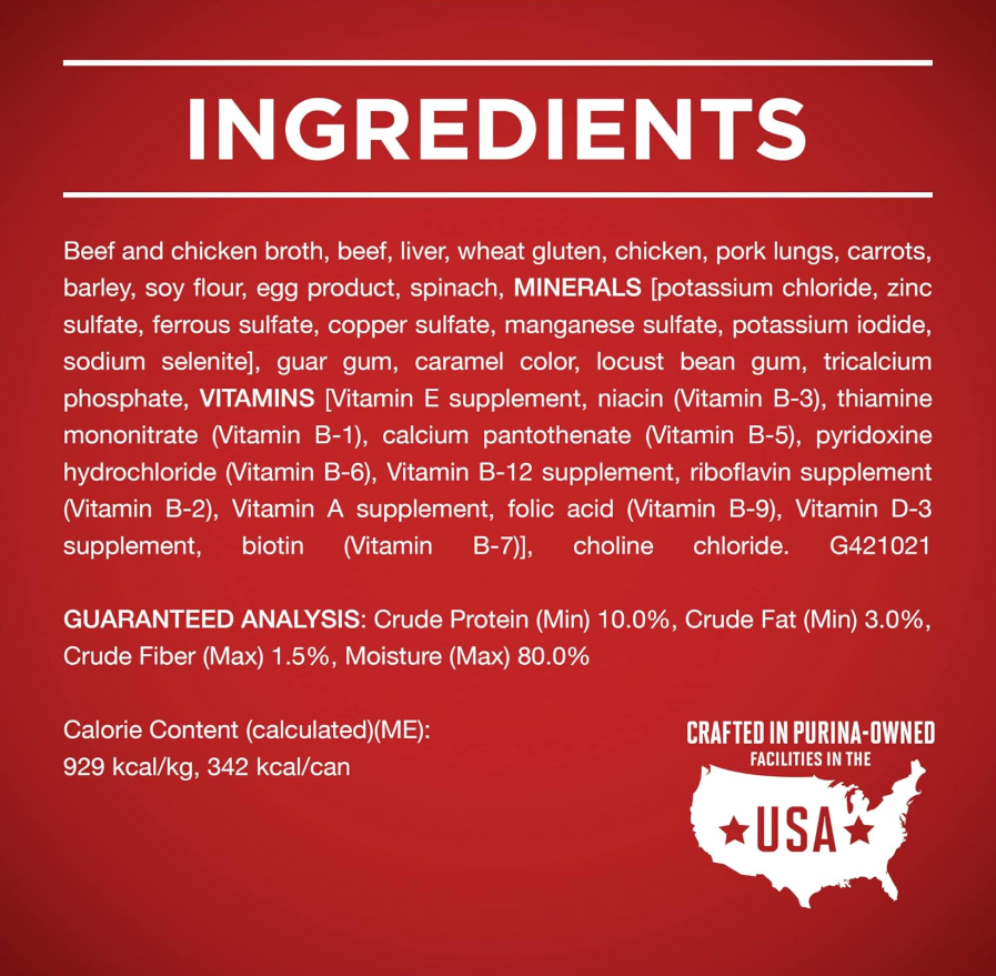 Natural dog food formula with added vitamins for dogs, minerals and nutrients made with real beef for the taste dogs love No poultry by-products in this dog wet food so your dog gets everything he needs and nothing he doesn’t 100 percent nutrition. 0 percent fillers. Every ingredient in this adult dog food formula has a purpose This Purina high protein canned dog food promotes whole-body health in adult dogs with 100 percent complete and balanced nutrition and antioxidants to support the immune system High protein dog food helps to support strong muscles, and a savory wet dog food gravy adds delicious flavor