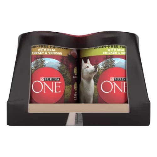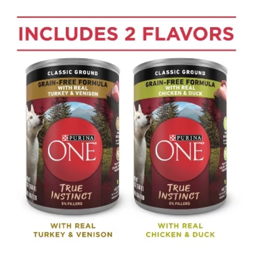 Description Keep your dog's dinners interesting with two nutritious and delicious formulas with this Purina ONE Classic Ground Entree Adult Dog Food Wet Variety ack Natural with Added Vitamins, Minerals and Nutrients. This pack contains six canned dog food recipes in two delicious flavors: Turkey and Venison Entree and Chicken and Duck Entree. Each Purina ONE dog food serving provides the nutrition your adult dog needs. With this Purina ONE adult wet dog food variety pack, you can switch from one great soft dog food flavor to the other to give him the flavor he wants and the nutrition he deserves. highlights Canned dog food with added vitamins, minerals and nutrients Purina ONE dog food variety pack with real poultry as the number 1 ingredient delivering protein to support strong muscles. 100 percent nutrition for adult dogs with 0 percent fillers, ensuring every ingredient in this dog food wet recipe has a purpose, such as antioxidants to help support a healthy immune system. Premium dog food made by veterinarian-recommended Purina ONE. Canned dog food formulated with adult dogs in mind and containing no poultry by-products and no artificial colors, flavors or preservatives. Loading content