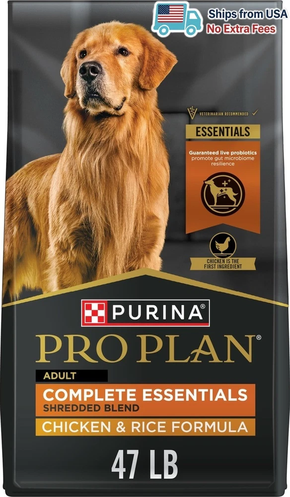 Purina Pro Plan Complete Essentials Adult Shredded Blend Dry Dog Food 47 lb Crunchy dog kibble combined with tender, shredded pieces for taste and texture dogs love. Fortified with live probiotics to help maintain gut microbiome resilience. Vitamin A and omega-6 fatty acids nourish the skin and coat, while natural prebiotic fiber helps deliver digestive support. This recipe is high in protein to support strong muscles, including a healthy heart; it also includes rice as a healthy source of energy-rich carbohydrates. Ingredients are carefully selected to provide key nutrients pets need; Purina Pro Plan dog food offers 100% complete and balanced nutrition for adult dogs. - All orders are shipped directly from our U.S. warehouse - no extra or hidden fees involved. - If you need any assistance regarding the product or your order, please message us. We will respond within 24 hours THANKS FOR WATCHING !!