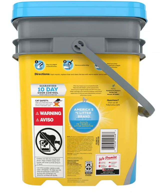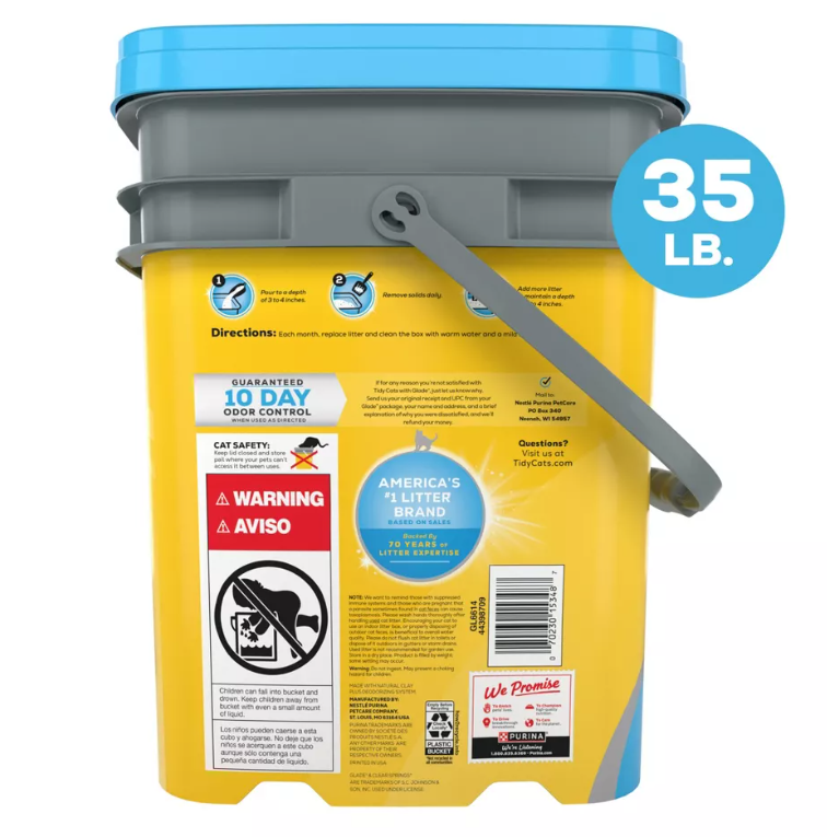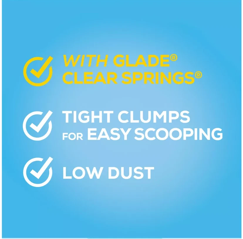 Details Highlights Guaranteed 10-day odor control when used as directed. Clay kitty litter forms strong. tight clumps for easy cleanup Low dust cat litter formula for a clean pour. Glade Clear Springs scented cat litter adds a pleasant fragrance to your litter box area Formulated for multiple-cat households. Locks in moisture to keep cats dry and comfortable Two trusted brands, one powerful litter. Backed by Tidy Cats' 70 years of litter expertise Powerful odor control cat litter leaves litter boxes fresh and inviting. Convenient packaging for easy storage Description Bring the power of two trusted names in odor control to your home with Purina Tidy Cats With Glade Clear Springs clumping cat litter. This clumping multi cat litter neutralizes ammonia, urine and fecal odors, keeping each cat litter box smelling clean and pleasant for 10 days when used as directed. Backed by the power of Glade, this clay cat litter defends against strong scents, leaving a fresh fragrance behind. Our low dust clumping cat litter solution forms strong, tight clumps, making cat litter box maintenance a simple task. Formulated for multiple cats, this cat litter stands up to regular use by all your feline family members, and the moisture-locking technology keeps them dry, comfortable and willing to use their boxes each day. Make it simple to check kitty litter box cleaning off of your list with this powerful odor-control solution, and get back to spending more quality time with your beloved cat companions. For the great formula you love and the performance you expect, now with a new look, trust in Purina Tidy Cats With Glade Clear Springs clumping cat litter.