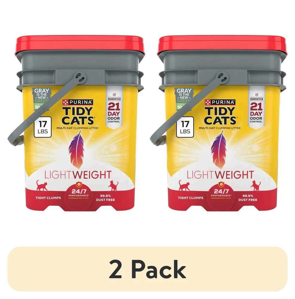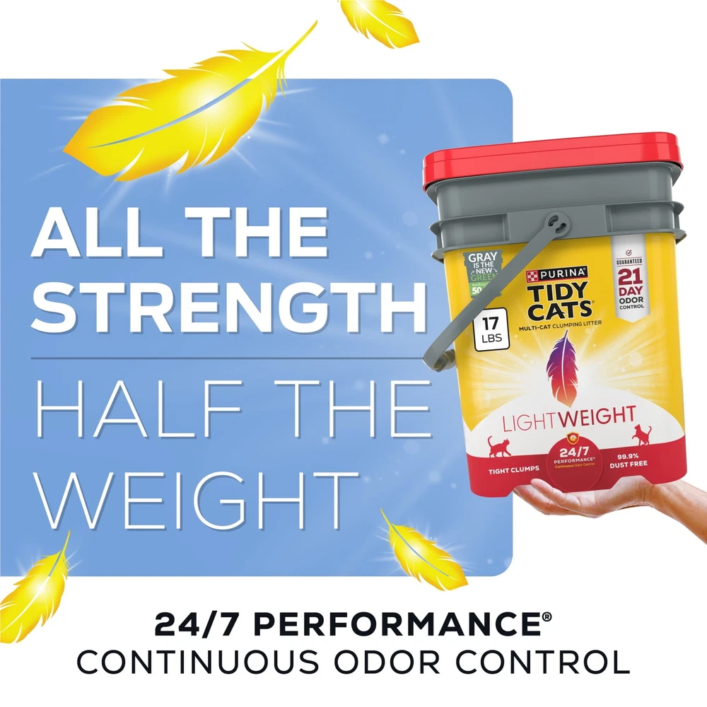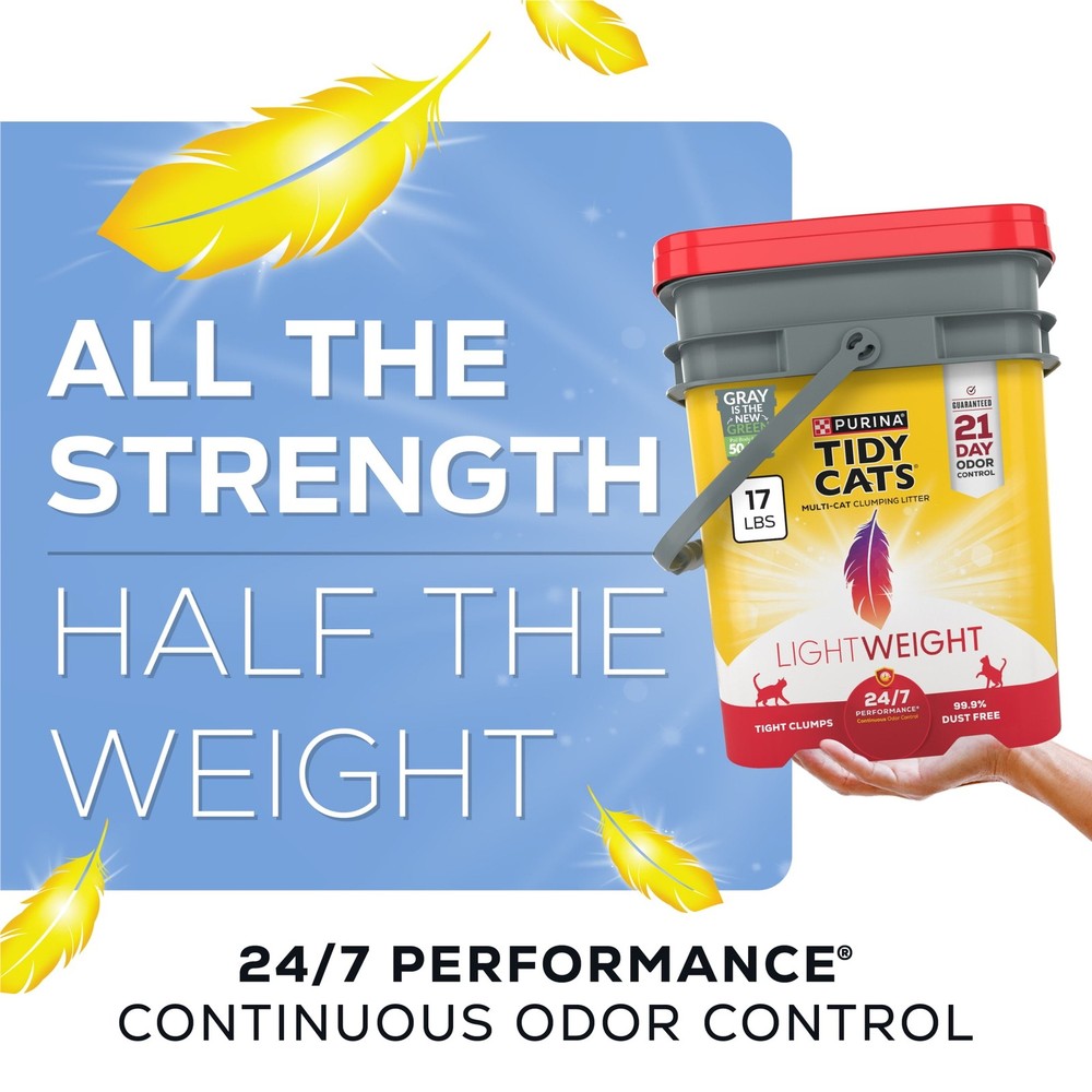 Conquer litter box maintenance without the pain of litterback with Purina Tidy Cats LightWeight 24/7 Performance clumping, scoopable cat litter. With an added Ammonia Blocker that keeps ammonia odor from forming for 21 days when used as directed, this cat litter lightweight offers great odor protection and the same amount of litter at a fraction of the weight of regular cat litter. This lightweight litter contains an innovative triple-odor protection to defend your home against strong smells, leaving behind a fresh scent. The kitty litter lightweight is easy to carry, weighing 50 percent less than the leading clumping cat litter and provides a clean and easy pour. The litter is 99.9 percent dust free and forms strong, tight clumps for quick and easy scooping, while the slow-release deodorizing system ensures continuous odor control with absorbency and clumping in every patented granule. Kitty litter 21-day odor control prevents ammonia odor from forming when used as directed Tidy Cats litter 50 percent lighter than the leading clumping litter Cat litter lightweight for multi-cat families features Clean Linen scent Cat litter clumping 99.9 percent dust free forms tight, strong clumps for less mess Spoil your pet with Purina products. Reward yourself with points on every purchase. Download the myPurina app today.