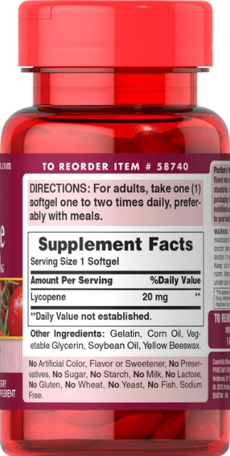 Puritan's Pride Lycopene 20 mg, Supplement for Prostate and Heart Health, 60ct US Warehouse - FREE & FAST Shipping in US Product Description: These statements have not been evaluated by the FDA. This product is not intended to diagnose, treat, cure, or prevent any disease or health condition. Promotes Prostate Health Supports Heart Health Helps Neutralize Harmful Free Radicals Lycopene promotes heart and vascular health, supports prostate function in men, and helps maintain overall good health. Some health experts believe the cardio-protective benefits of the Mediterranean diet can be explained at least in part by the inclusion of lycopene-rich foods like tomatoes and tomato-based products. One medium red tomato contains approximately 3 mg of lycopene. However, the amount of natural lycopene in the foods we eat is variable and will change as fruit ripens. Studies also show lycopene is one of the major carotenoids found in the prostate gland, making it important for prostate health. Feedback: 1.Any question for your order, please contact us in time, we will reply to you within 24 hours and give you a satisfactory answer. 2.If you are satisfied with our products and services, hope to take up your a little precious time to leave feedback reviews for our products.Thanks! 3.Your satisfaction is our effort. Welcome to order again! Have a great day! Our Policy: 100% Satisfaction Guarantee 20% of restocking fee will be charged for return item