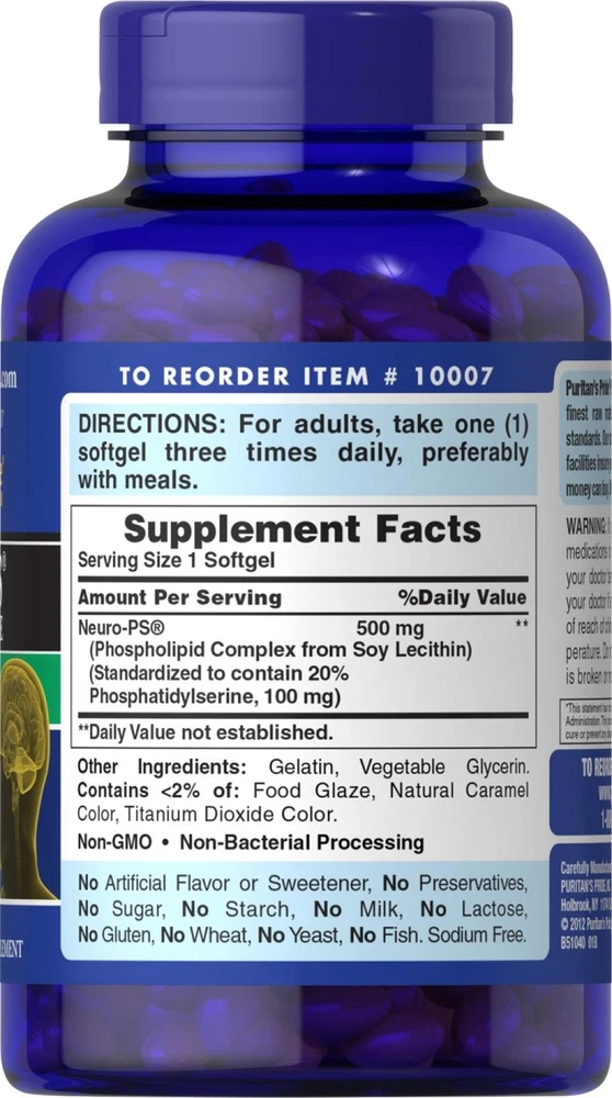 Our eBay Store Contact Us Add to Favorite Sellers Puritan's Pride Neuro-PS (Phosphatidylserine) 100 mg-120 Softgels Wellness means nourishing body, mind and spirit. So what are some ways to keep your mind healthy?You can start with trying out new hobbies, reading more, engaging in social activities and maintaining a healthy diet that provides essential nutrients for the brain. As far as supplements go, Puritans Pride Neuro-PS is one source you can turn to for brain nutrition. *Phosphatidylserine (PS) is a naturally occurring substance thats a key component of the brain. * It plays a role in neurotransmitter release and ion transport. * Neuro-PS helps replenish Phosphatidylserine levels, which may decline with age. * Neuro-PS aids brain function and supports a healthy mind. *Appears in the brain, especially in the neurons � the complex series of central nervous system pathways responsible for exchanging sensory information-Consumption of phosphatidylserine may reduce the risk of cognitive dysfunction in the elderly. Very limited and preliminary scientific research suggests that phosphatidylserine may reduce the risk of cognitive dysfunction in the elderly. FDA concludes there is little scientific evidence supporting this claim. Aids brain function*. Supports a healthy mind*. Helps replenish PS levels*. Levels may decline with age*. Contains a one-month supply of easy-to-swallow softgels. Free Shipping on all Orders $20 and Up