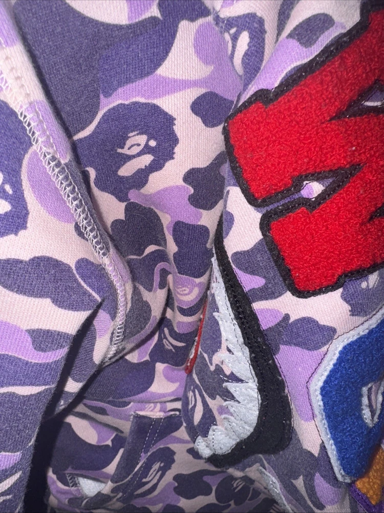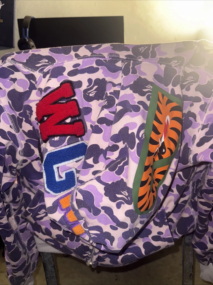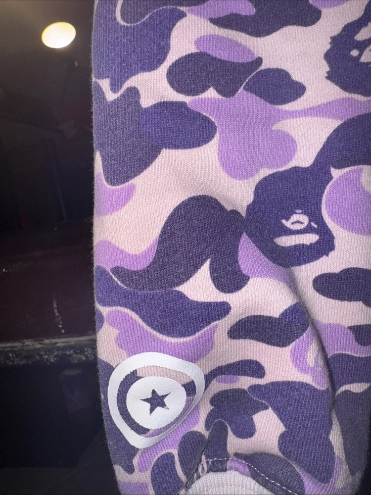 Great condition barley worn, This stylish Lilac Bape hoodie is a must-have for any fashion-forward man. The striking purple color is sure to turn heads and make a statement. Made from high-quality materials, this hoodie is designed to provide comfort and durability, making it perfect for everyday wear. Ideal for men who appreciate activewear, this hoodie is suitable for a range of occasions. Whether you're hitting the gym or simply running errands, this versatile hoodie is the perfect addition to your wardrobe. With its eye-catching design and high-quality construction, it's sure to become a favorite.