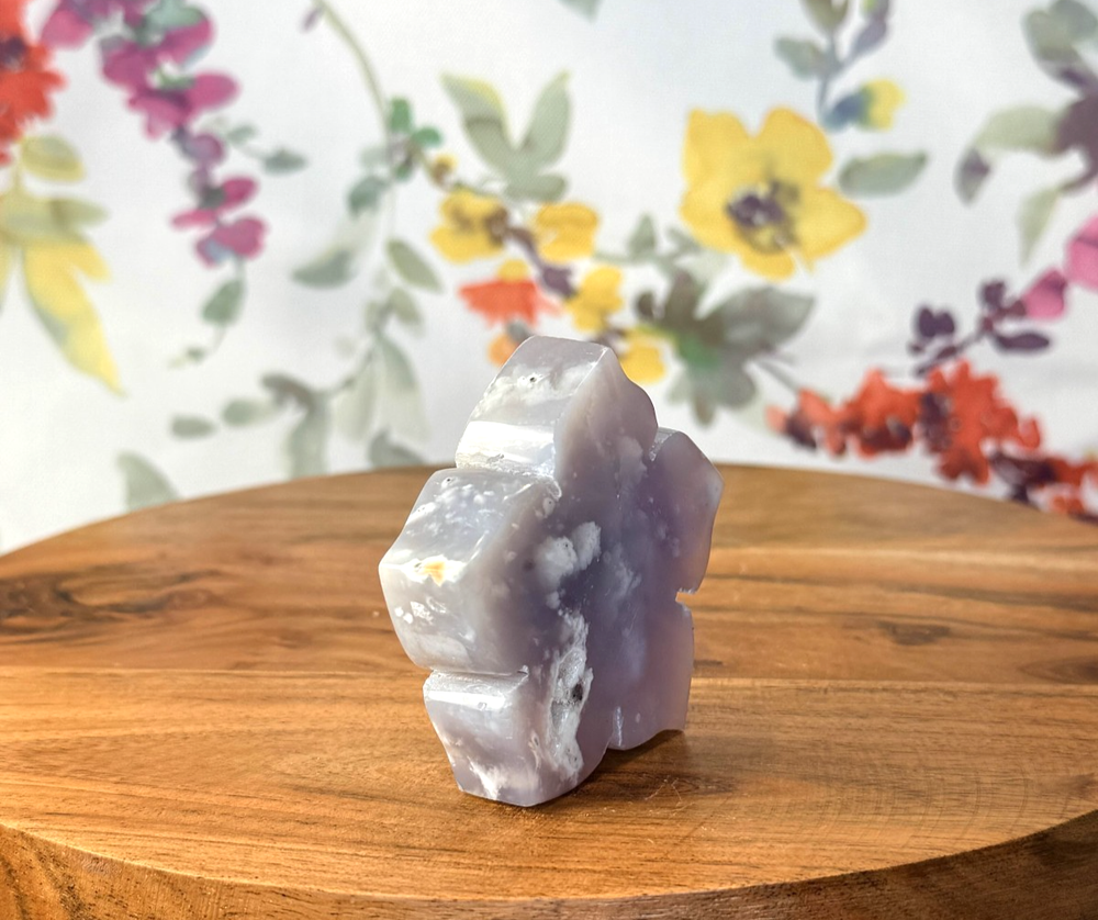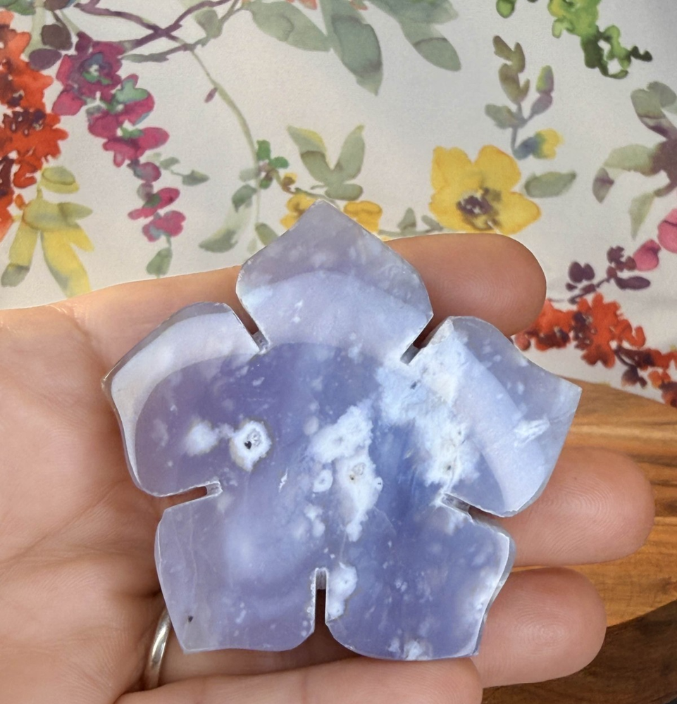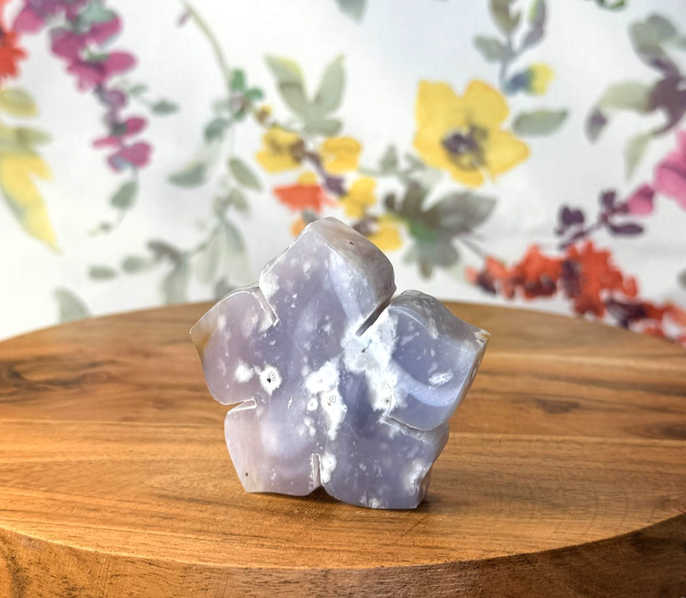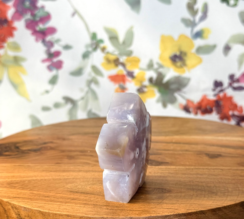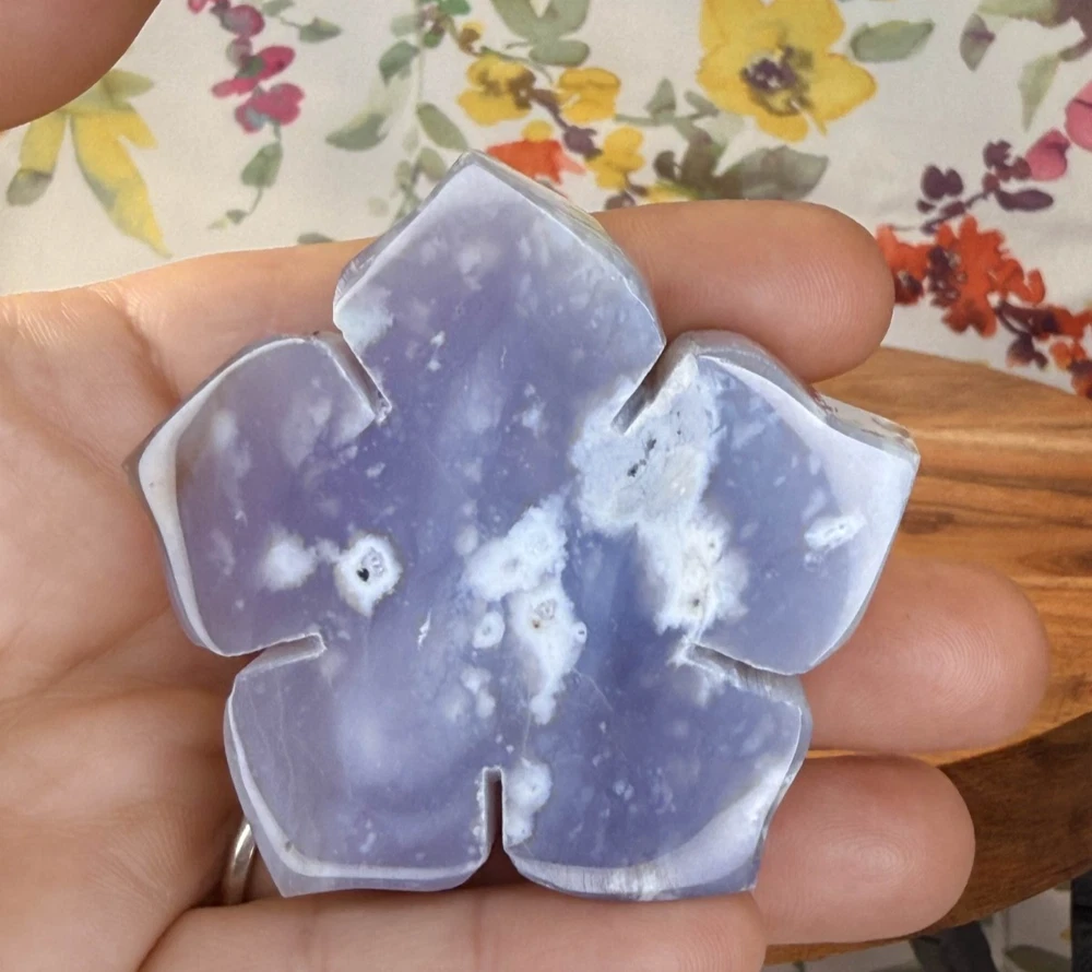 Chalcedony is a type of microcrystalline quartz that is known for its iridescent quality and variety of colors. In this case, the purple color adds a unique and vibrant touch to the flower-shaped crystal, making it a standout piece for collectors. 2.5" Diameter x 1/2" Thick