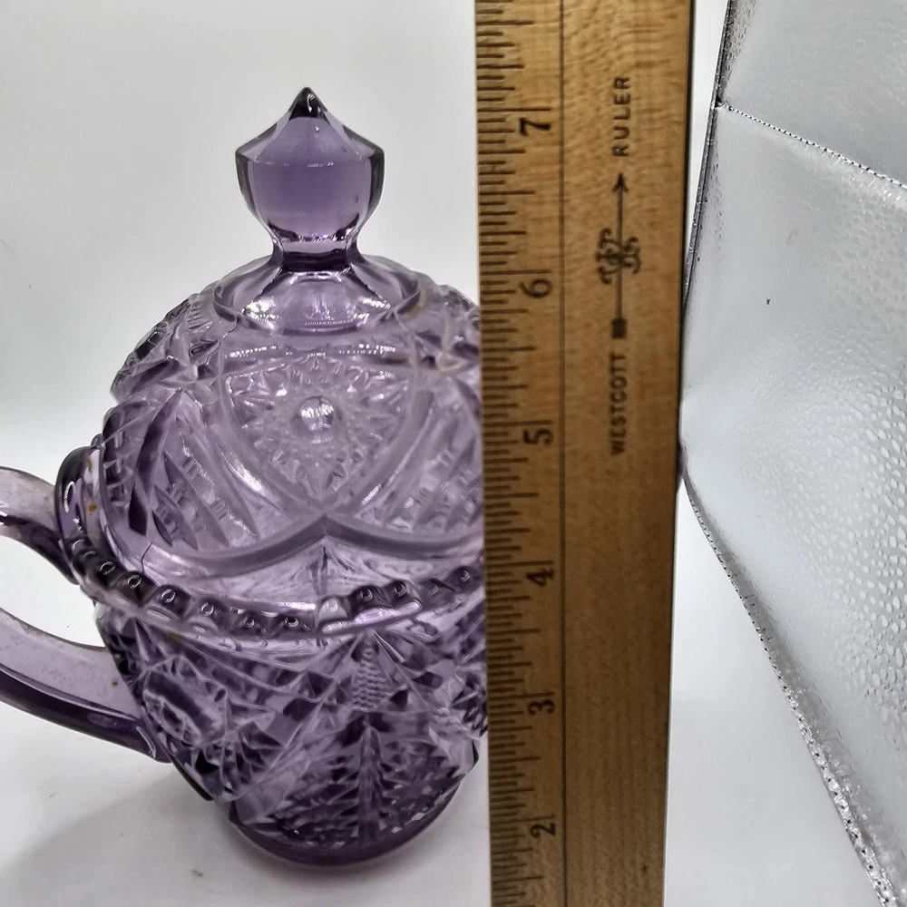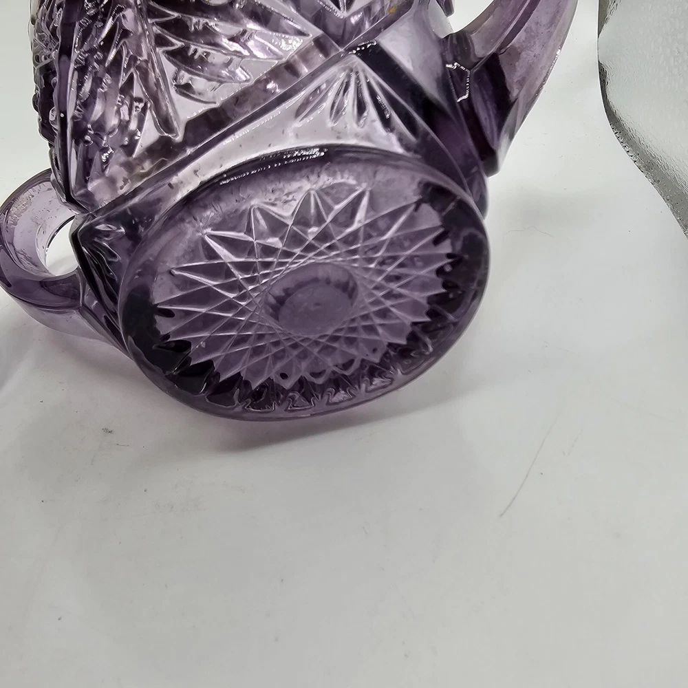 This vintage candy dish is a stunning addition to any collection. The ornate design features an etched cut glass lid and is made of high-quality glass material. The dish is perfect for storing candies, nuts, or other small items. The brand is unmarked, adding to the unique and timeless appeal of the piece. The production style is cut glass, a technique that adds depth and texture to the dish. The purple color is rich and vibrant, making it a standout item on any tabletop. This candy dish is a must-have for collectors of vintage glassware. There is a rough edge along rim... feels like chipping. Sold as is