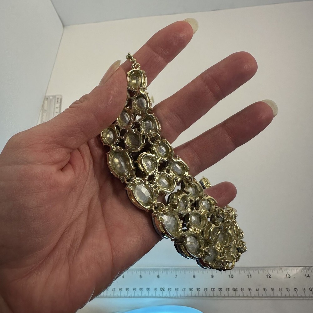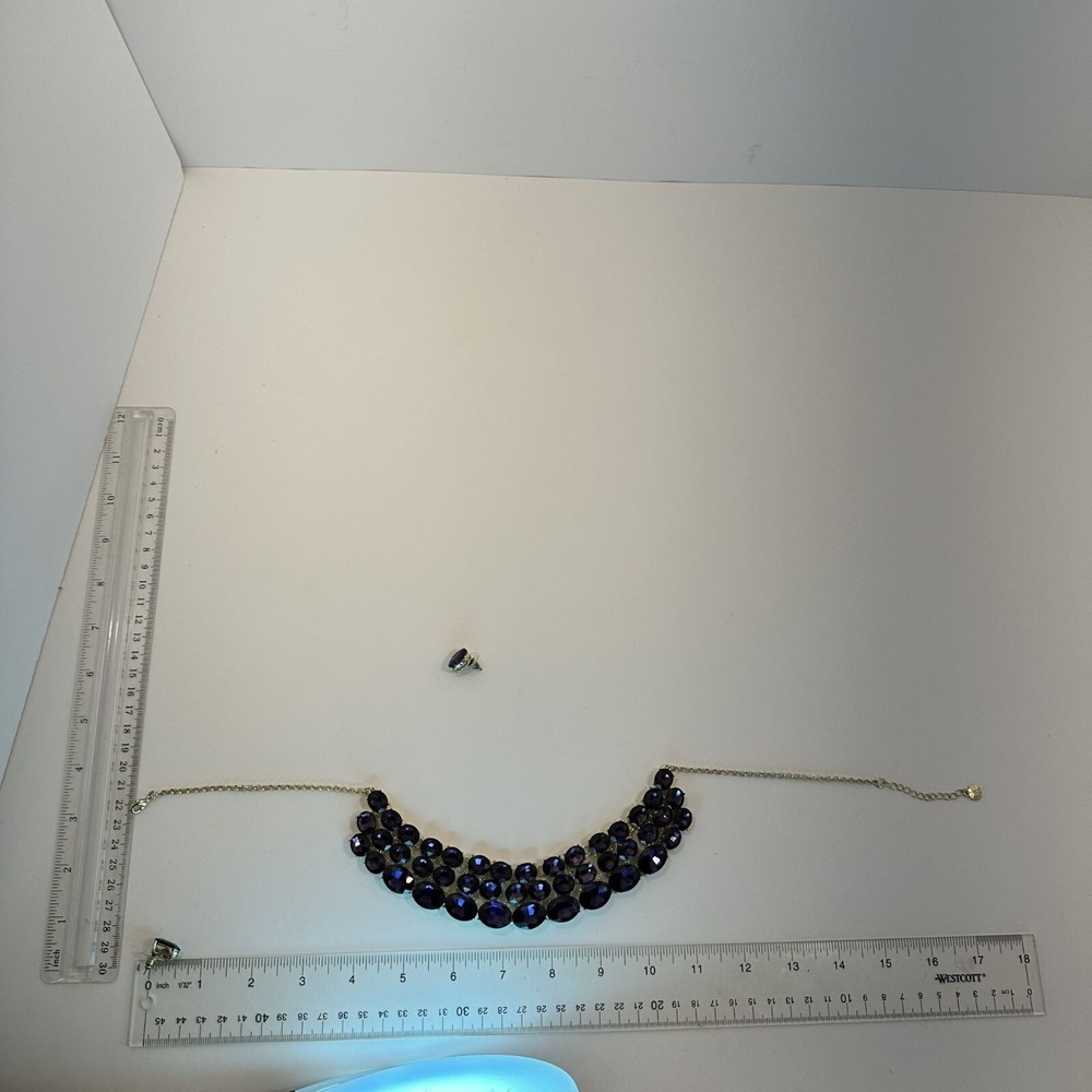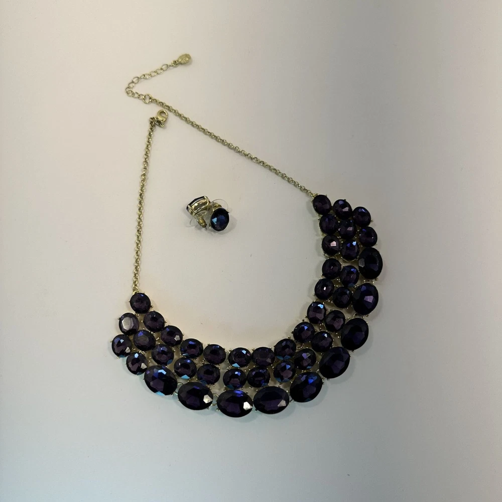 Elegant jewelry set with bold purple stones, suitable for upscale events. Features a gold-plated finish for added sophistication. • Adjustable chain clasp for a secure fit • Matching ring included, adjustable • Lightweight for comfortable wear • High-quality faceted stones for sparkle Necklace length = 18 inches Good condition.