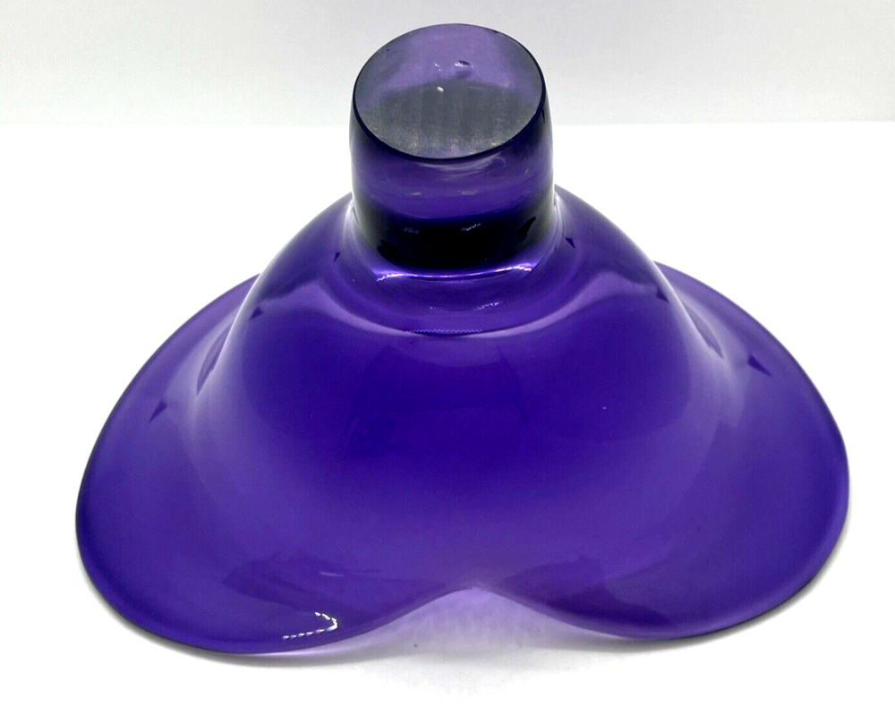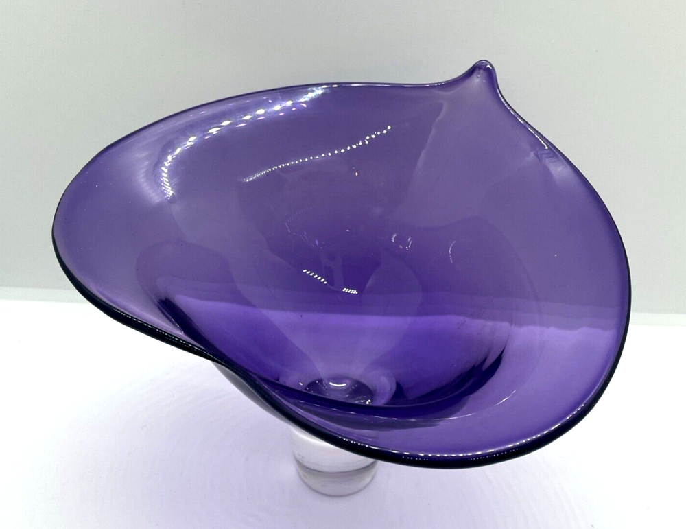 Purple Heart Art Glass Centerpiece Pedestal Bowl Mueseum of Glass Signed 2004 Valentines This art glass piece is in excellent pre owned vintage condition. There are no chips or cracks. It measures 6' x 7.5". Please note the photos for detail.
