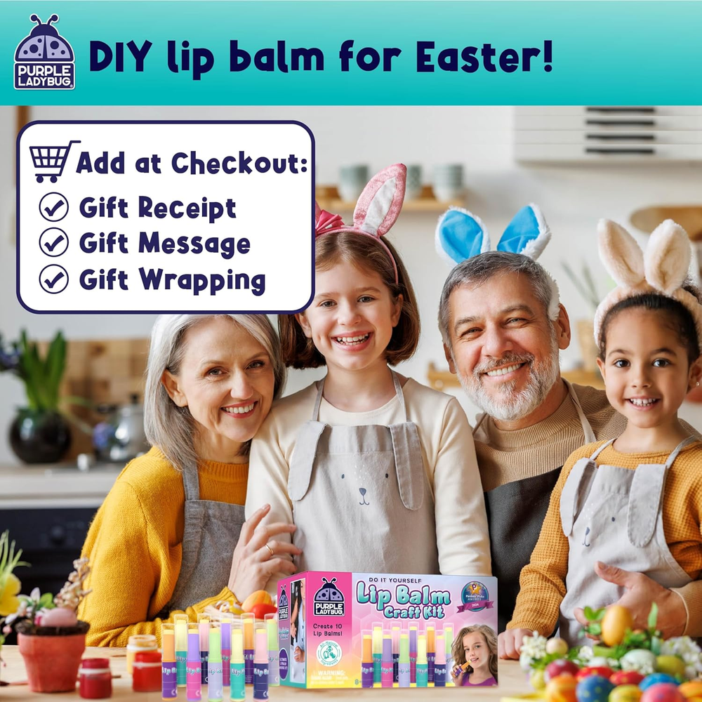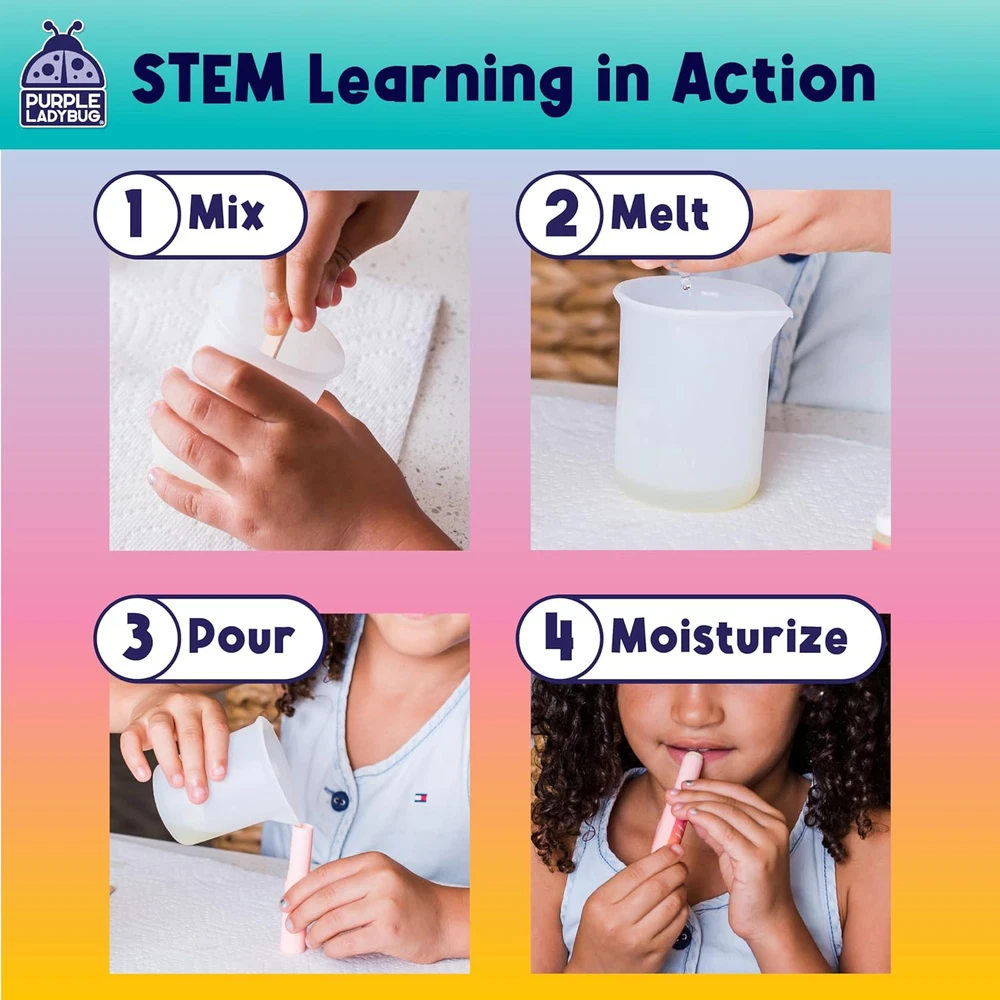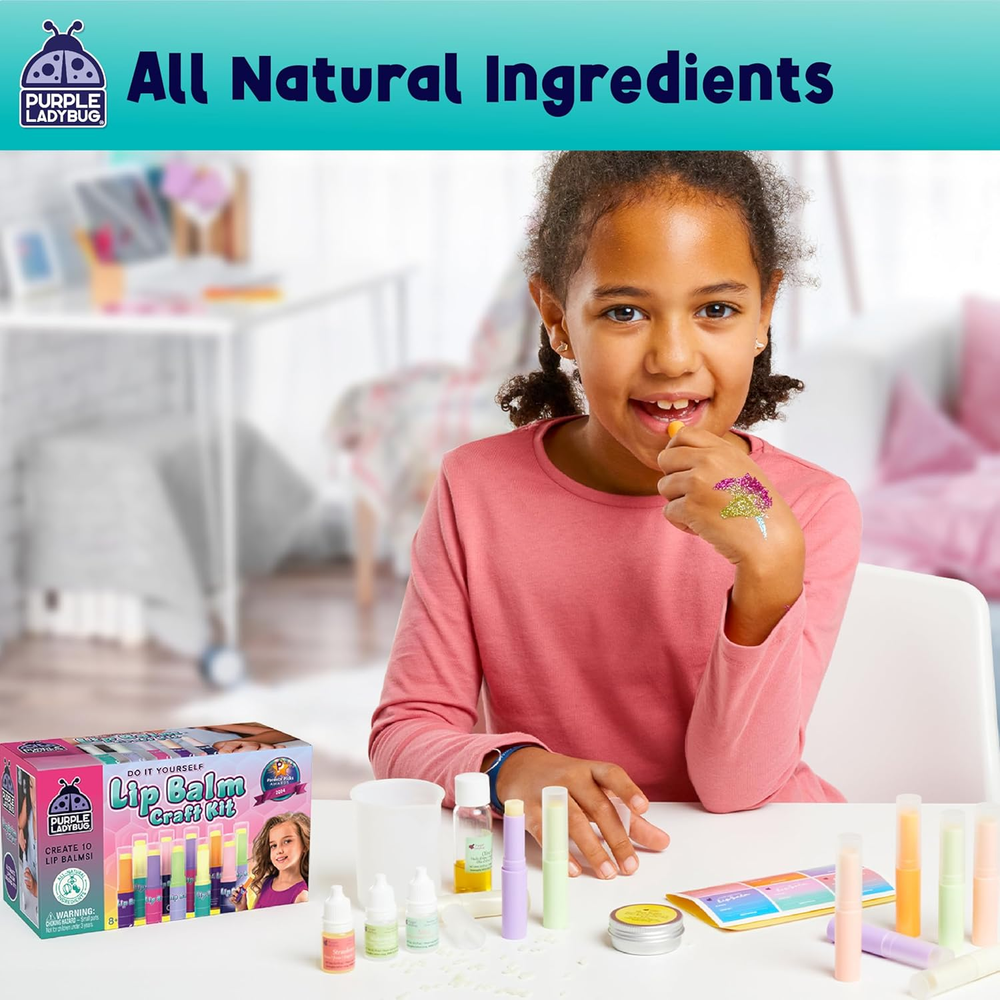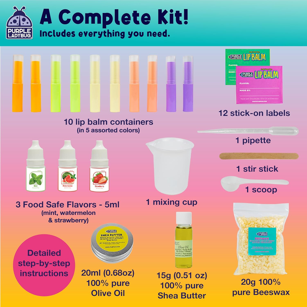 MAKE YOUR OWN LIP BALMS – Kids can create 10 high quality lip balms to use or gift to friends with this diy lip balm kit. Optional flavors mean kids can create watermelon, strawberry, or mint lip balms if they choose to and the stickers allow them to label their lip balms! ALL NATURAL INGREDIENTS – Have total confidence in what your children have on their lips and skin with Purple Ladybug make your own lip balm kit for girls. Our lip balms are made out of three high-quality ingredients: beeswax, shea butter, and olive oil. STEM PROJECT FOR KIDS – Encourage experimentation as kids create their own lip balms by mixing different ratios of the ingredients, and using the enclosed pipette to draw up their lip balms and fill the containers! Make science fun and show how it’s part of our everyday lives! COMPLETE CRAFT KIT – Our lip balm making kit for kids includes enough olive oil, shea butter and beeswax to fill all 10 lip balm containers (in 5 assorted colors). They all come with clear lids. We also include optional flavors (watermelon, strawberry, and mint), 12 stick-on labels, 1 mixing cup, 1 scoop, 1 pipette, and 1 stir stick. MAKES A GREAT GIFT – Encourage a fun DIY activity that helps kids learn about science, mixing, experimentation and that leaves them with beautiful, functional lip balm when they’re done! Comes in an attractive box that you’ll be proud to give. Product Description The video showcases the product in use. The video guides you through product setup. The video compares multiple products. The video shows the product being unpacked.