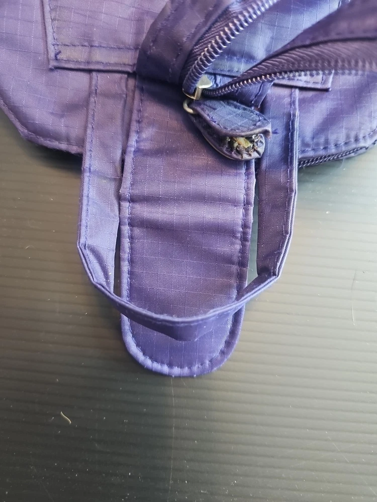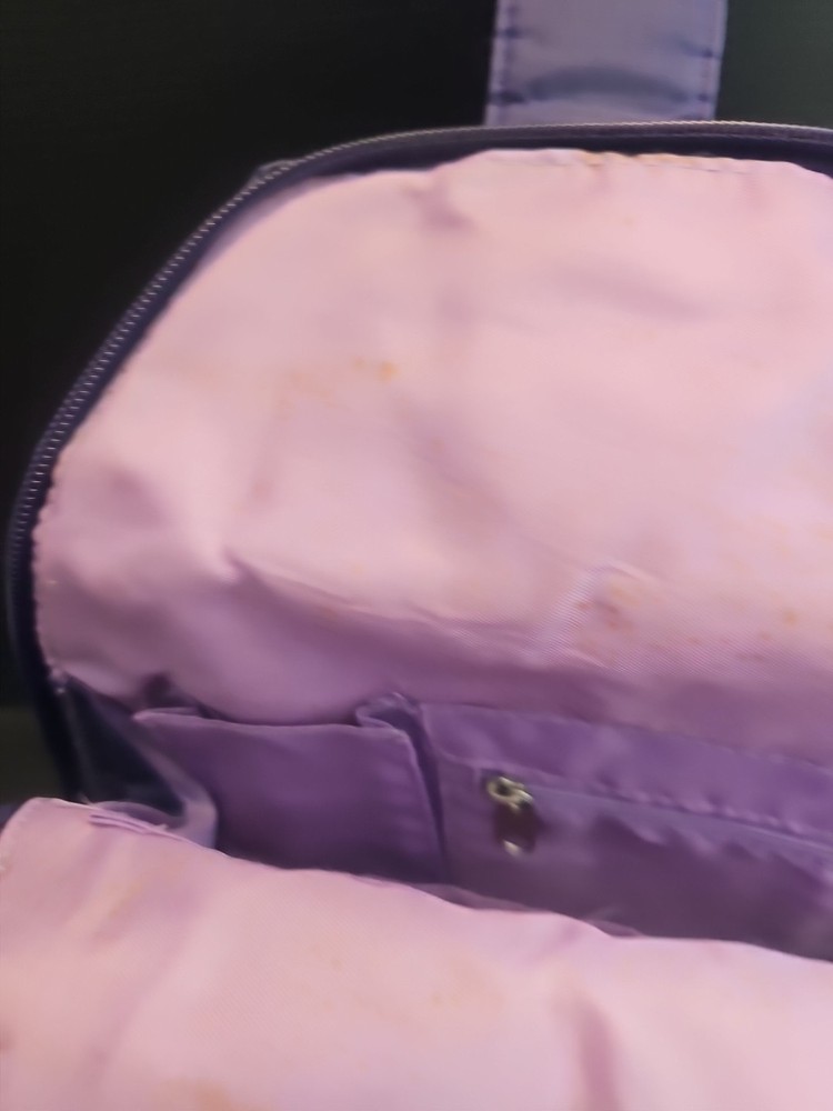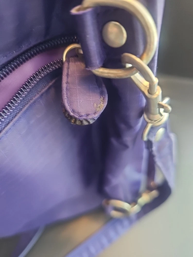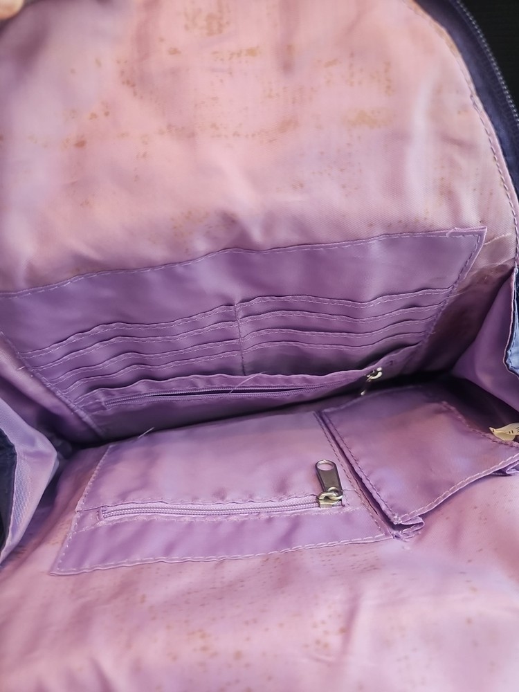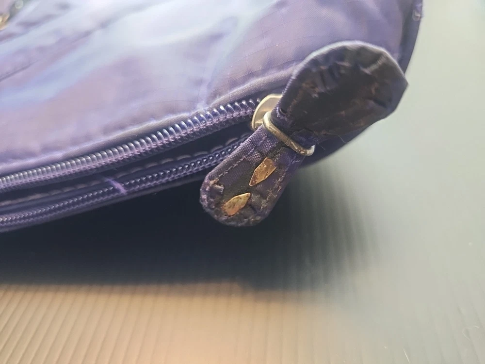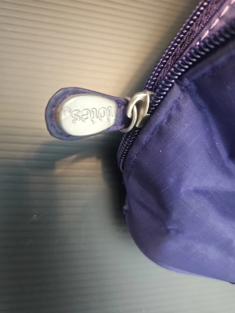 The Totes Purple Waterproof Mini Backpack is a stylish and functional accessory for women on the go. With a solid purple exterior and zip closure, this backpack features a removable strap for added versatility. The waterproof nylon exterior and zippered pockets make it perfect for keeping your belongings safe and dry during outdoor adventures. The mini size and zippered pockets provide convenient storage for all your essentials, while the light purple lining adds a touch of femininity. Perfect for everyday use or special occasions, this backpack from Totes is a must-have addition to any wardrobe. The interior lining has damaged to the color. the pictures and the price reflect this.