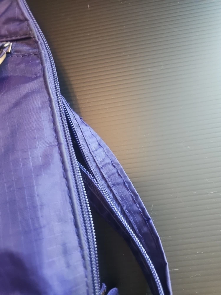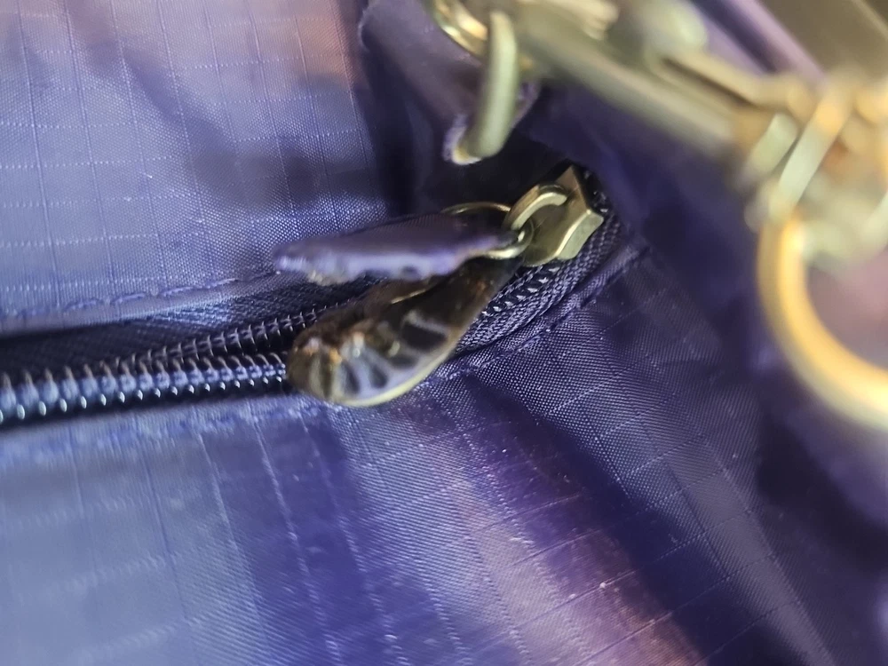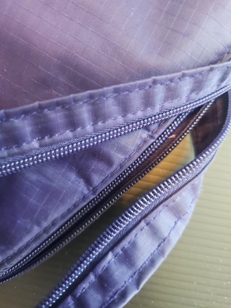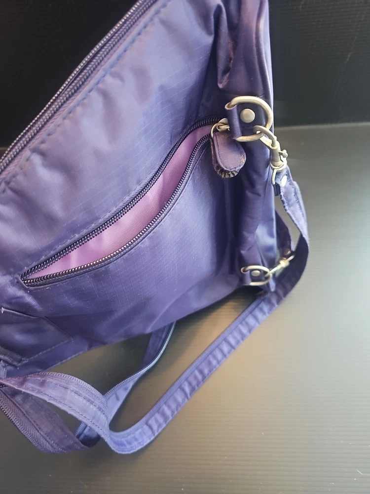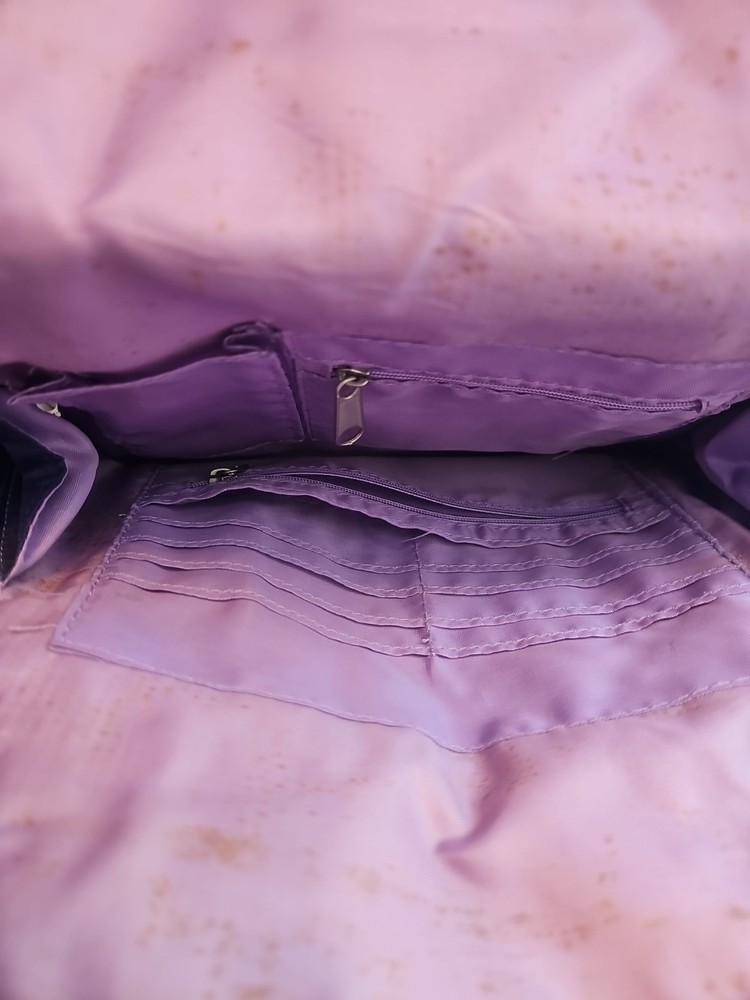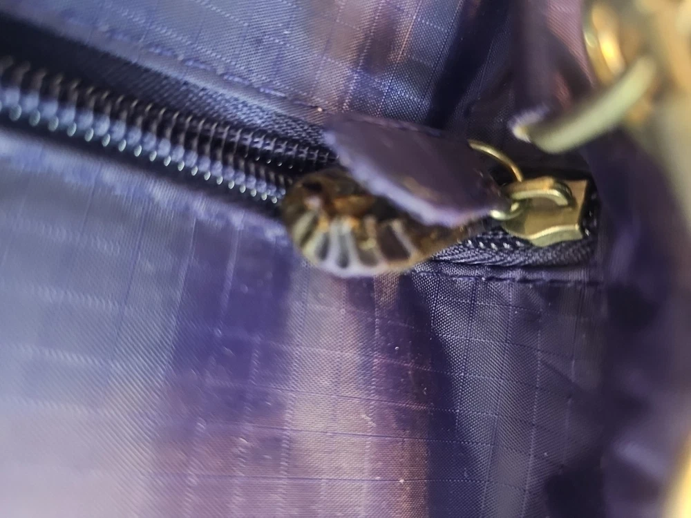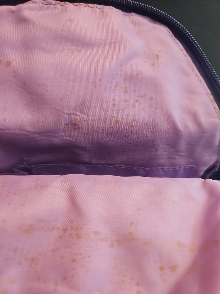 The Totes Purple Waterproof Mini Backpack is a stylish and functional accessory for women on the go. With a solid purple exterior and zip closure, this backpack features a removable strap for added versatility. The waterproof nylon exterior and zippered pockets make it perfect for keeping your belongings safe and dry during outdoor adventures. The mini size and zippered pockets provide convenient storage for all your essentials, while the light purple lining adds a touch of femininity. Perfect for everyday use or special occasions, this backpack from Totes is a must-have addition to any wardrobe. The interior lining has damaged to the color. the pictures and the price reflect this.