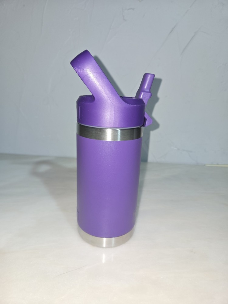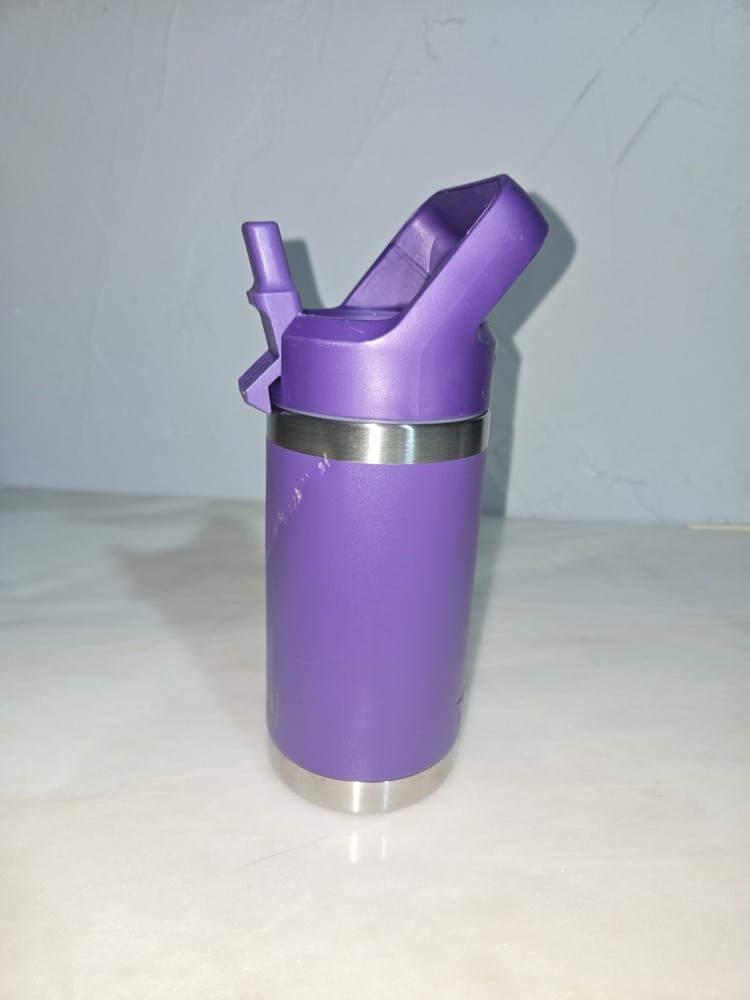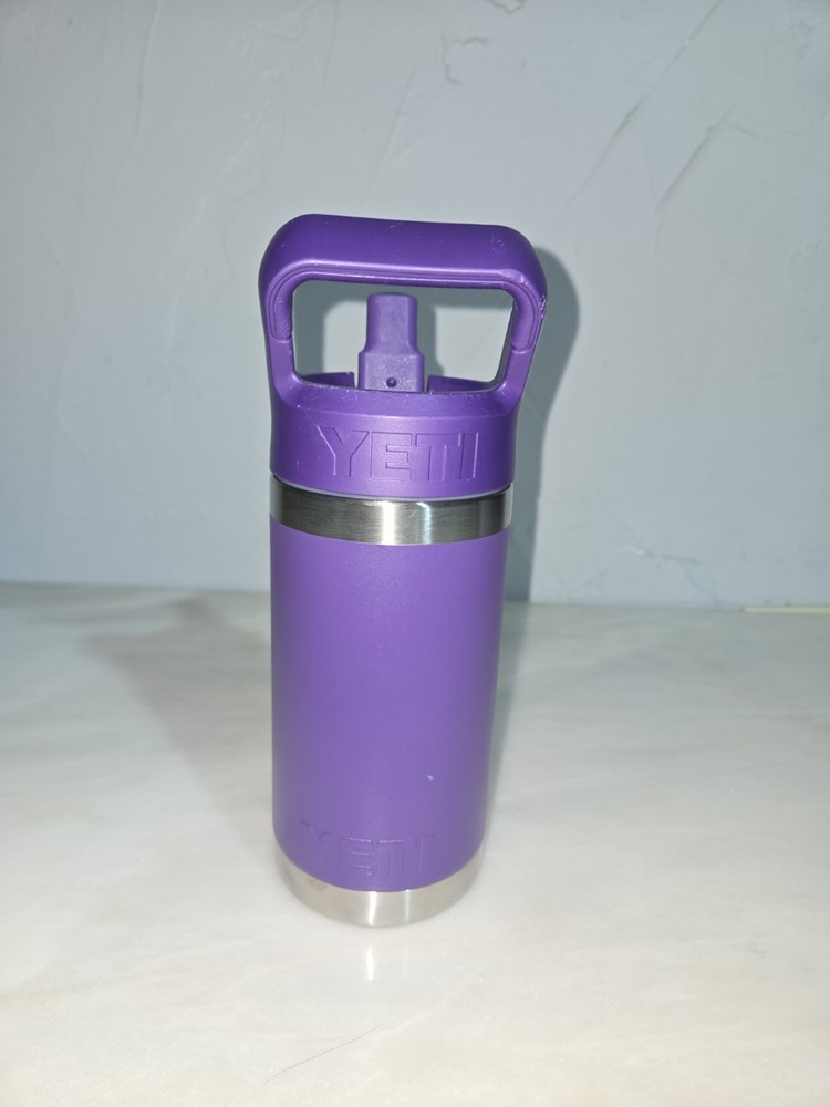 purple YETI Rambler Jr. 12 oz kids' bottle with a straw cap. This bottle is designed with double-wall vacuum insulation to keep drinks cold and is made from durable stainless steel to withstand drops and bumps. The straw cap is leak-resistant when closed and both the bottle and cap are dishwasher-safe.