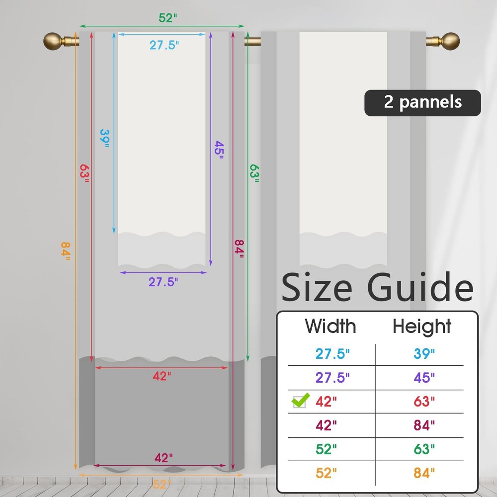 Package Includes --- 2 Curtain Drape. Each curtain Approximately 42"(W) x 63"(H),total 84"(W) x 63"(H). Rod Pocket---curtain rods will easily slide through top of window treatment.can fit most window curtain rods. Made from --- High quality 100% polyester China fabric material. Per set including 2 panels. extremely soft to touch. Function --- It's decorative curtains for living room,bedroom,kitchen,dining room , Please be kindly noted that these are unlined drapes,eco-friendly and only can block out 30~ 50% sunlight while still provide privacy. Easy Care --- Machine washable. Tumble dry low. Wrinkles will be disappeared after hanging for a few weeks, or iron at low setting Package Includes: Per set including 2 panels; each curtain approximately 42 inch width x 63 inch height, total 84 inch width x 63 inch height Rod Pocket: Curtain rods will easily slide through top of window treatment; Can fit most window curtain rods Made from: High quality polyester fabric material; Extremely soft to touch Function: It's decorative curtains for living room, bedroom, kitchen, dining room; Please be kindly noted that these are unlined drapes, only can block out 30~50% sunlight while still provide privacy Easy Care: Machine washable; Tumble dry low; Wrinkles will be disappeared after hanging for a few weeks, or iron at low setting