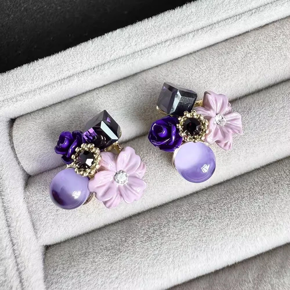 The product is a jewelry set that includes purple diamond cat's eye crystal flower earrings. The earrings are likely designed with purple diamond cat's eye crystals in the shape of flowers, creating a unique and elegant look. The use of crystal elements adds a touch of sparkle and sophistication to the overall design of the earrings, making them a stylish accessory for various occasions.