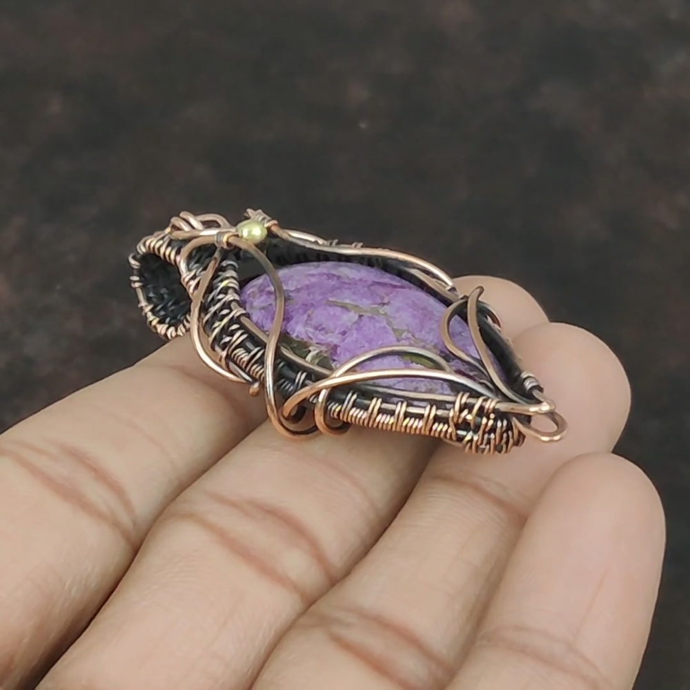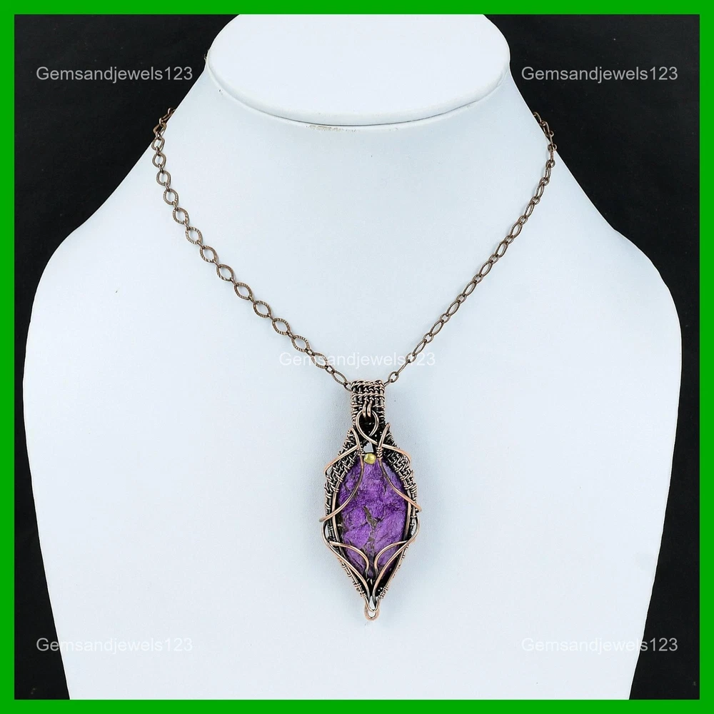 Note : Due to the natural formation of this gemstone. Slight Variation in design and color are to be expected. Welcome to gemsandjewels123 Mothers day Sale Oval Purpurite Gemstone Wire Wrapped Anniversary Pendant Copper Handmade Pendant, Wire Wrapped Pendant, Wire Wrapped Jewelry, Copper Pendant, Copper Wire Pendant, Wrapped Jewelry, Wire Wrap Pendant, Wire Wrap Jewelry SKU : VFWP-691 Gemstone : Purpurite Stone Shape : Oval Metal Purity : Unknown Copper Length : 70 Millimeters Width : 30 Millimeters Copper has been used for jewelry making for thousands of years, dating back to ancient civilizations such as the Egyptians, Romans, and Aztecs. Copper was valued for its beauty, versatility, and durability, and was often used to make everything from jewelry and coins to cookware and tools. In addition to its historical significance, copper jewelry also offers several benefits. Copper is a natural conductor of heat and electricity, which makes it ideal for energy healing and therapeutic purposes. Wearing copper jewelry is believed to have various health benefits, such as improving circulation, reducing inflammation, and boosting the immune system. Some people also believe that copper jewelry has the ability to balance energy and improve mood. For Mother's Day Gift For Father's Day Gift For Promise For Valentine's Day For Halloween Party For Christmas Day Gift For New Year Party For Mom For Her If you can't find the information you need or need some advice for your design? Feel free to contact us. We are fast to reply :) All our work is made by hand with Love and Care in our workshop Thank you so much for visiting and hope you enjoy shopping with us gemsandjewels123 is committed to delivering the best quality sterling silver jewelry to customers. As a handmade jewelry manufacturer, we offer an extensive selection of copper gemstone jewelry that showcases the brilliance of our craftsmanship. We are an experienced handmade jewelry supplier with expertise in embellishing gemstones to suit every style. We offer you the liberty to create your jewelry ensemble with sparkling, earthy, and pure gemstones. Our Talented artisans masterfully handcraft each piece of jewelry you see here. Our pieces are made with genuine gemstones. The one-of-a-kind piece you see here is the same exact piece you will receive.