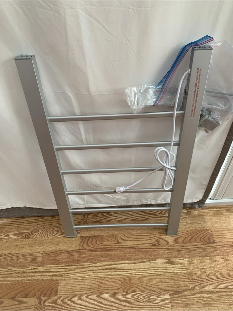New electric towel warmer. There’s some minor scratches to the finish pointed out in photos, it came this way. We received a different model as a gift and have been using that one instead, so this was never used. All accessories to make it free standing or mount to the wall are included. Items pictured are the items you will receive Ships from the smoke free pet free home